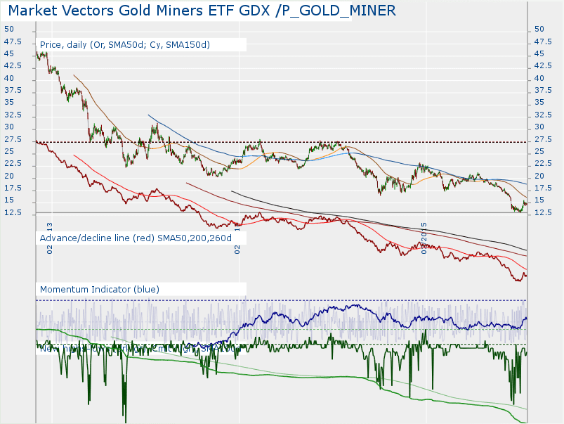 I've put a number of gold miners in my screener and I calculate breadth for this group. I'm not sure whether this is a valid for a sector and frankly a small group of stocks chosen fairly arbitrarily. Breadth chart below. I'm not sure whether it is a good shorting option or not. However, it does look like it is not going up anytime soon.