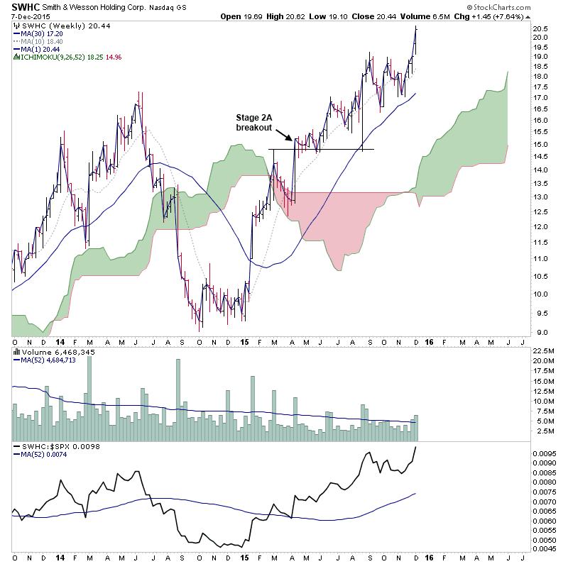 No. The Stage 2A breakout point for SWHC wasn't until April 2015, as the breakout point that you are refering to didn't meet the Stage Analysis criteria, as in Jan 15 it's still had a declining 30 week MA. See Stans' Don't Commandments in the book. The relative performance was still below it's zero line, and as you can see from the attached chart, it was still below near term resistance. So only one of the four key criteria was met in Jan 15's breakout.