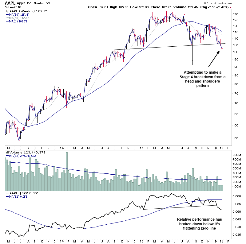 AAPL - I highlighted this a month ago when it had pulled back from it's initial Stage 4A breakdown attempt, and it's now attempting to break below the long term support from the head and shoulders pattern and relative performance has broken down below a flattening zero line. Potential for full Stage 4 breakdown if it doesn't reverse this week, and remember this has largest weighting in the S&P 500, so could affect market sentiment if it does complete the breakdown.