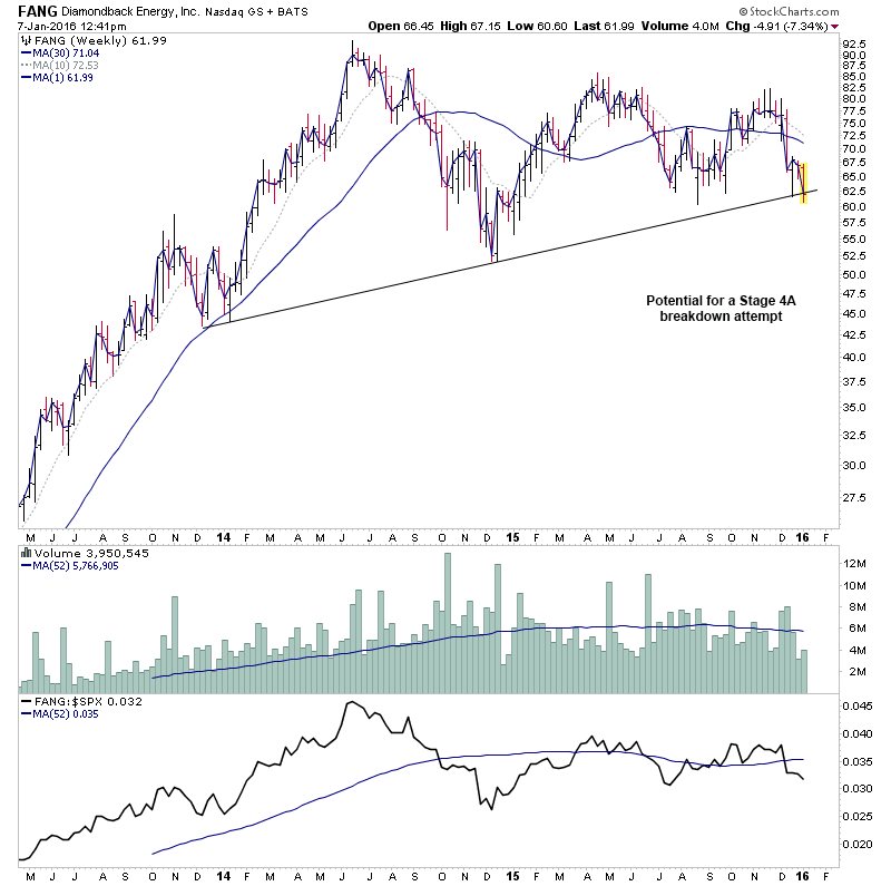 FLT - attempting to make a Stage 4 breakdown with weaking relative performance below it's zero line. Longer term monthly chart is also breaking below it's 30 month average for the first time.