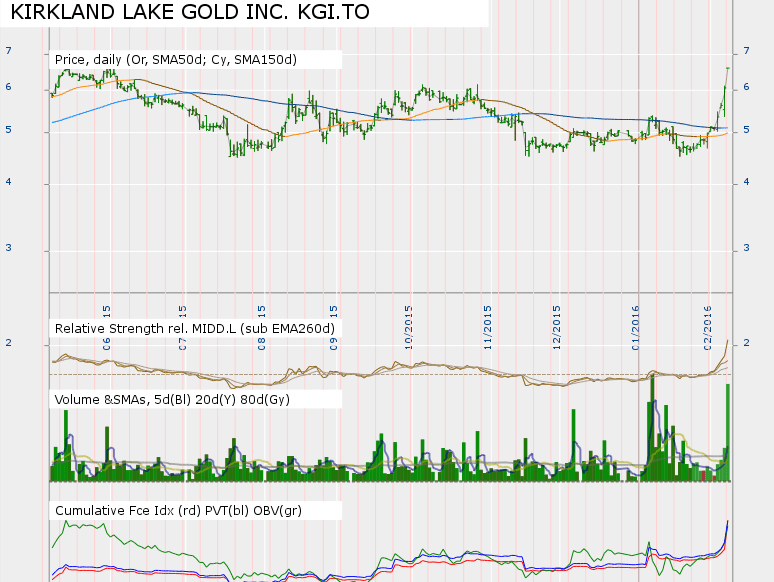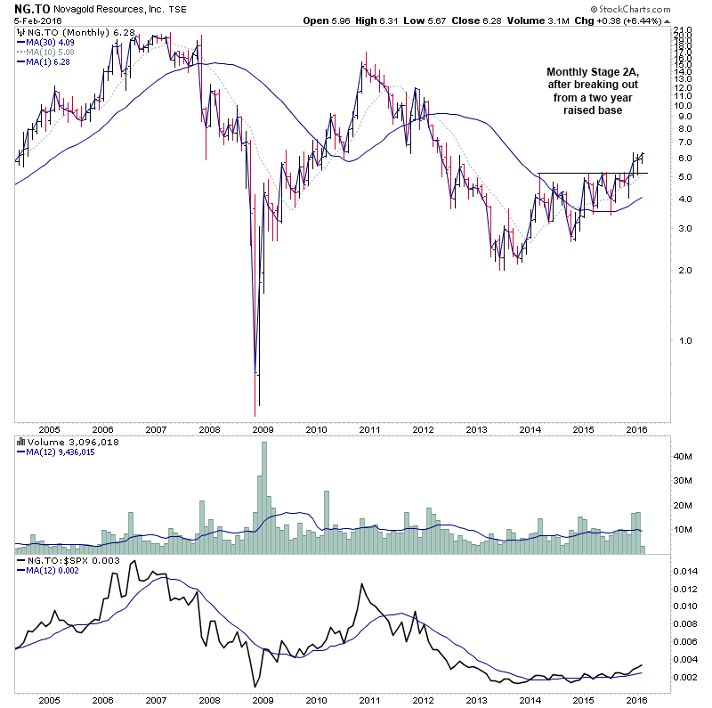 The Canadian listing broke out into Stage 2A in December, as highlighted on here last month, but is now looking to make it first minor continuation attempt. And the monthly chart is also in Stage 2A, and so this is considerably stronger than most gold stocks, as the majority only have monthly charts attempting to move back into Stage 1A. Hence with the monthly already in Stage 2A, NG.TO has little overhead resistnace to hamper it. So looks promising as an investor position.