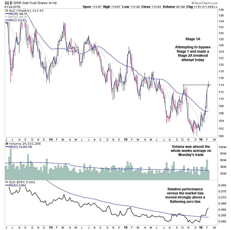 Attached is the GLD etf chart, as it illustrates the volume coming into gold over the last week, as was around two times the weekly average last week, and already is around the normal weekly average just from Monday's trade. So volume has increased significantly and US dollar priced gold is attempting to bypass Stage 1, and go straight for a Stage 2A breakout attempt, which it got above today, but then pulled back below to close the day.