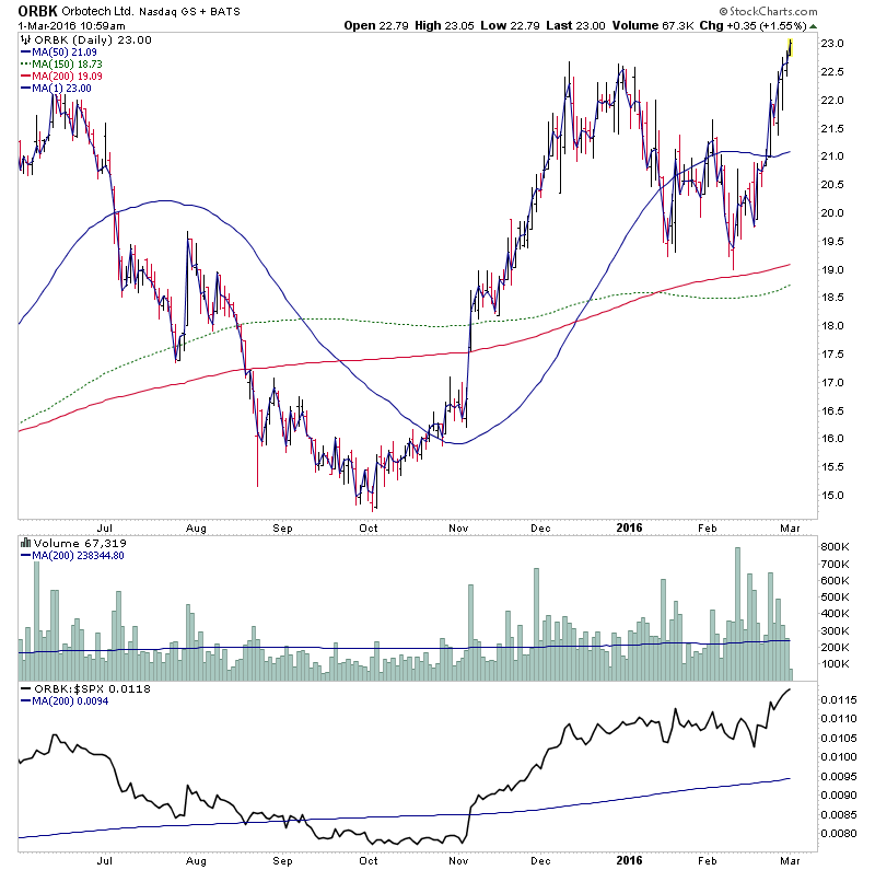 ORBK - Stage 2 continuation attempt with good volume and strong relative performance from a volatility contraction pattern.