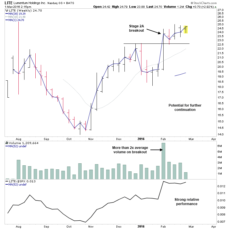 LITE - Potential for a further continuation following a Stage 2A breakout four weeks ago. Relative performance is at it's highs and volume was more than 2x the weekly average on the breakout week.