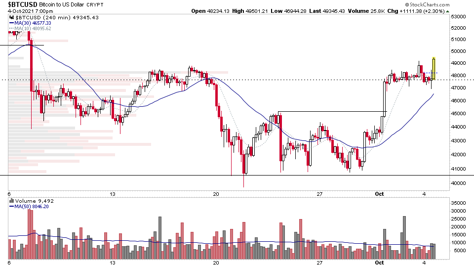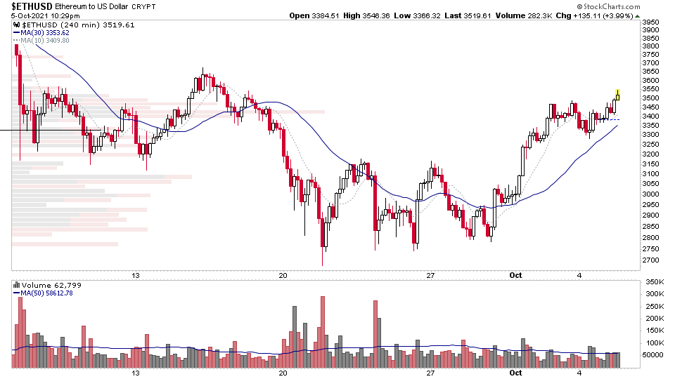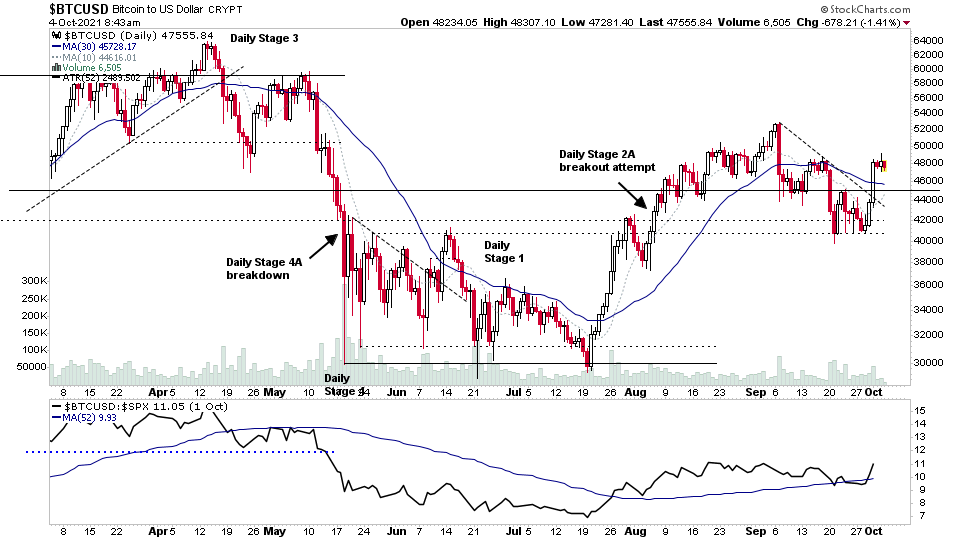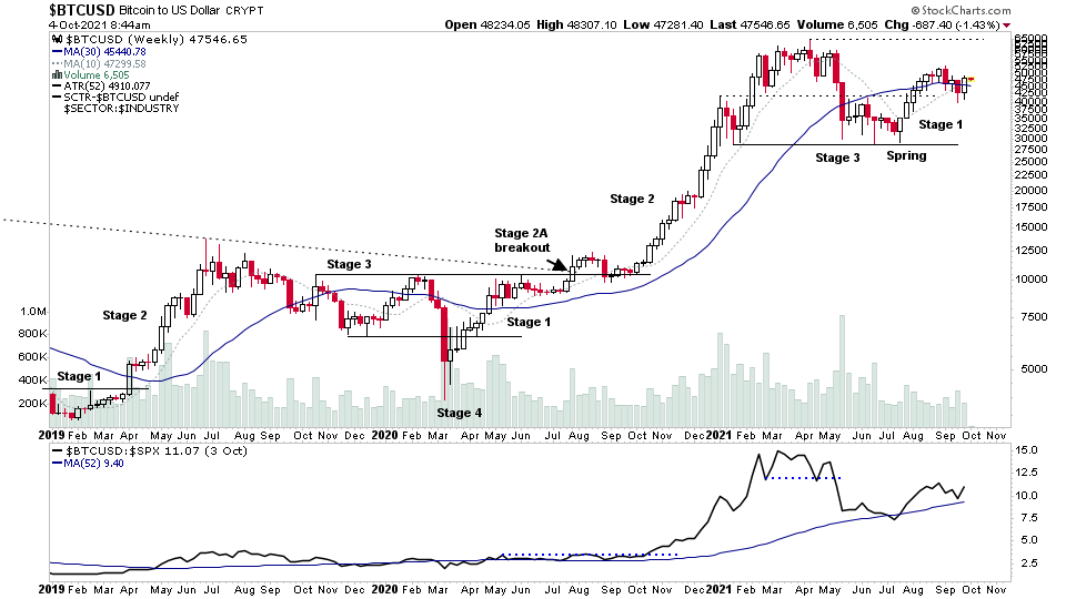 Percentage of Crypto Currencies above their Moving Averages breadth charts - isatrader - 2021-10-02 % Above 20 day MA: 46.31% (+36.24%) % Above 50 day MA: 28.00% (+5.85%) % Above 150 day MA: 49.67% (+11.41%) % Above 200 day MA: 38.51% (+4.95%) Average: 40.62% (+14.61%) Status Change to Positive The overall average moved back to positive status after rebounding from the lower zone last week, which you can see especially in the 20 day MA chart. The 50 day chart is at 28%, and so is also close to moving out of the lower zone. RE: Crypto Currencies - Bitcoin, Ethereum, Ripple, Litecoin, Cardano & more - isatrader - 2021-10-04 Bitcoin developing in the backup range Bitcoin - isatrader - 2021-10-04 Bitcoin attempting to follow through from the weekend consolidation RE: Crypto Currencies - Bitcoin, Ethereum, Ripple, Litecoin, Cardano & more - isatrader - 2021-10-05 Ethereum continuing to develop its Stage 1 base RE: Crypto Currencies - Bitcoin, Ethereum, Ripple, Litecoin, Cardano & more - isatrader - 2021-10-06 Bitcoin Relative strength versus the S&P 500 at new highs ahead of price action RE: Crypto Currencies - Bitcoin, Ethereum, Ripple, Litecoin, Cardano & more - isatrader - 2021-10-06 (2021-10-06, 12:22 PM)isatrader Wrote: Bitcoin Relative strength versus the S&P 500 at new highs ahead of price action Bitcoin new weekly Stage 2 breakout attempt or Wyckoff Phase E RE: Crypto - isatrader - 2021-10-08 $EGLD.X Elrond attempting to breakout from an intraday VCP and back above the +1x ATR level $ONE.X Harmony pushing back towards the highs again $SOL.X Solana watching for a Stage 2 continuation breakout attempt Percentage of Crypto Currencies above their Moving Averages breadth charts - isatrader - 2021-10-10 % Above 20 day MA: 84.56% (+38.26%) % Above 50 day MA: 42.28% (+14.28%) % Above 150 day MA: 68.24% (+18.57%) % Above 200 day MA: 45.27% (+6.76%) Average: 60.09% (+19.47%) Status: Positive Environment Note. Volume shown on stockcharts crypto charts is wrong currently. They are aware of the issue and trying to fix. |