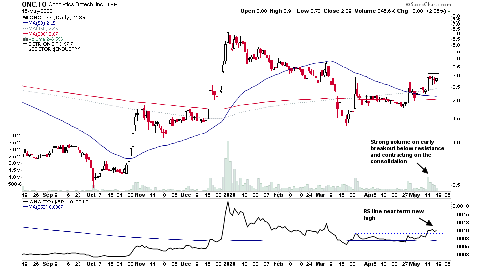 RE: Stage Analysis Beginners Questions - mucked4u - 2020-05-11 I second the thanks. I too was wondering where these charts and groups were RE: Stage Analysis Beginners Questions-STN.TO - isatrader - 2020-05-11 (2020-05-10, 03:41 PM)marry123 Wrote: STN.TO (attached) has broken out of a 6 year base recently so looks like it would be a buy above 42.39 (recent high). Anything wrong that you can find with this stock in terms of a proper entry above recent highs? Also attached a 2 hr chart. Thank you. The breakout from the massive six year range in November is a good sign long term for this imo, as is a big base, so has potential for a strong Stage 2 advance. I can see a bit of an inverse head and shoulders pattern on the daily chart. But the breakout attempt today occurred on under average volume and the relative strength versus the S&P 500 didn't make a new high either, so you would need to see some follow through tomorrow with increased volume imo. As volume pickup and relative strength at new highs is always present in the best breakouts. RE: Stage Analysis Beginners Questions-STN.TO - marry123 - 2020-05-12 (2020-05-11, 09:48 PM)isatrader Wrote:(2020-05-10, 03:41 PM)marry123 Wrote: STN.TO (attached) has broken out of a 6 year base recently so looks like it would be a buy above 42.39 (recent high). Anything wrong that you can find with this stock in terms of a proper entry above recent highs? Also attached a 2 hr chart. Thank you. Thanks, Isa. The volume was the one nagging issue, as compared to the breakout in November of 2019 it looks anemic, but I will watch to see if perhaps it starts to come in this week. RE: Stage Analysis Beginners Questions-silver - marry123 - 2020-05-16 Hi Isa, I was hoping you could comment on silver and PAAS. Many are commenting on how gold and silver are about to run much higher (they popped Thursday and Friday, especially silver) yet silver to me looks suspect on the weekly as it just got over its 30 MA which is declining since March and the weekly volume this week was very poor despite the price jump. Do you see red flags with silver? Silver miners looks good based on the chart, I believe, so I was wondering whether PAAS (chart looks good) could be a buy now or whether it should break its recent high of around 26 to enter long. Also, it seems you are focussing on gold miners not silver miners on your weekly watch list so wondering why you are not also focussing on silver miners (perhaps there is a red flag with these)? Thanks for your thoughts. RE: Stage Analysis Beginners Questions-silver - isatrader - 2020-05-16 (2020-05-16, 01:47 PM)marry123 Wrote: Hi Isa, Hi marry123, I did actually highlight PAAS in my twitter stream yesterday earlier in the day, as it was showing good relative strength and a volume spike on the breakout from its handle pattern, and also SSRM came up on the 12th, and will be appearing in the weekend watchlist also, as it broke out yesterday following earnings results. So PAAS and SSRM are two of the strongest looking silver stocks currently imo. Gold is testing its high, and so the mining stocks all got a boost this week, but it hasn't made the continuation breakout yet, although the mining stocks ETFs of the GDX and GDXJ did breakout, although volume was only slightly better than average in those. So it's by no means confirmed yet and could easily reverse still, as volume needs to come in for these stocks to breakout convincingly. Silver, is much more volatile than Gold, and also its recovery from the March lows hasn't been anywhere near as strong, and hence only a few silver miners have appeared in the watchlists, compared to numerous gold stocks. And Silver has a much stronger correlation to the stock market than Gold, and so if the market pulls back then silver miners tend to also. So generally they haven't been appearing in the watchlist as not many have been showing strong RS and making good quality patterns yet. But as we noted above, there are a few beginning to come through. But it's also crucial to remember that risk management is the priority with any trade entry point. So a good general rule is not try to buy too extended from the breakout level, of which a max +5% above the pivot point is a good general rule, although it might be a little bit higher max for more volatile stocks like silver miners depending on their Average True Range (ATR). RE: Stage Analysis Beginners Questions-silver - marry123 - 2020-05-16 (2020-05-16, 02:38 PM)isatrader Wrote:(2020-05-16, 01:47 PM)marry123 Wrote: Hi Isa, Thanks Isa, I will keep reading your posts re gold and silver miners and see if volume comes in, and also be mindful of not buying something that may have become quite extended from the proper buy point. RE: Stage Analysis Beginners Questions-ONC.TO - marry123 - 2020-05-17 Hi Isa, I was hoping you could comment on ONC.TO. It is a biotech and the chart looks very good, I think. It broke out on huge volume in January (ran from around 1.50-8), it pulled back and is now back above a rising 30 MA and above the weekly cloud. Last week very good volume came in and it is not too far from the 30 MA. The only issue I can see is that the 50 MA is below the 150 MA on the daily still so maybe I would need to enter if the 50 MA gets above the 150 MA on the daily. Thanks for your thoughts. RE: Stage Analysis Beginners Questions-ONC.TO - isatrader - 2020-05-17 (2020-05-17, 06:11 PM)marry123 Wrote: Hi Isa, Hi marry123, Technically it is looking promising short term, with a volume pop and contraction on the recent early move, and so a close above $3ish would be a potential short term buy point. However, it's highly speculative so not something I'd consider personally, as the percentage distance of the -2x the 52 week ATR max stop loss that I use would be -49% below the current price, and I prefer for this figure to be more in the -10% range personally, as anything below that becomes exponentially more difficult to recover from. So is a reasonable short ter