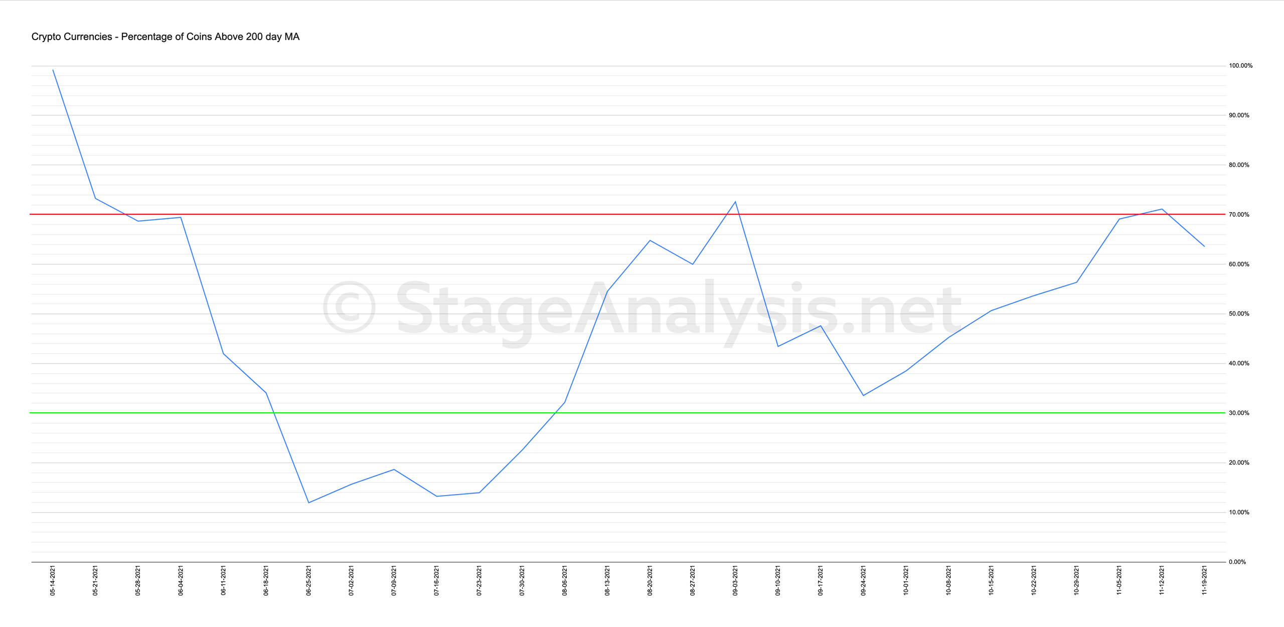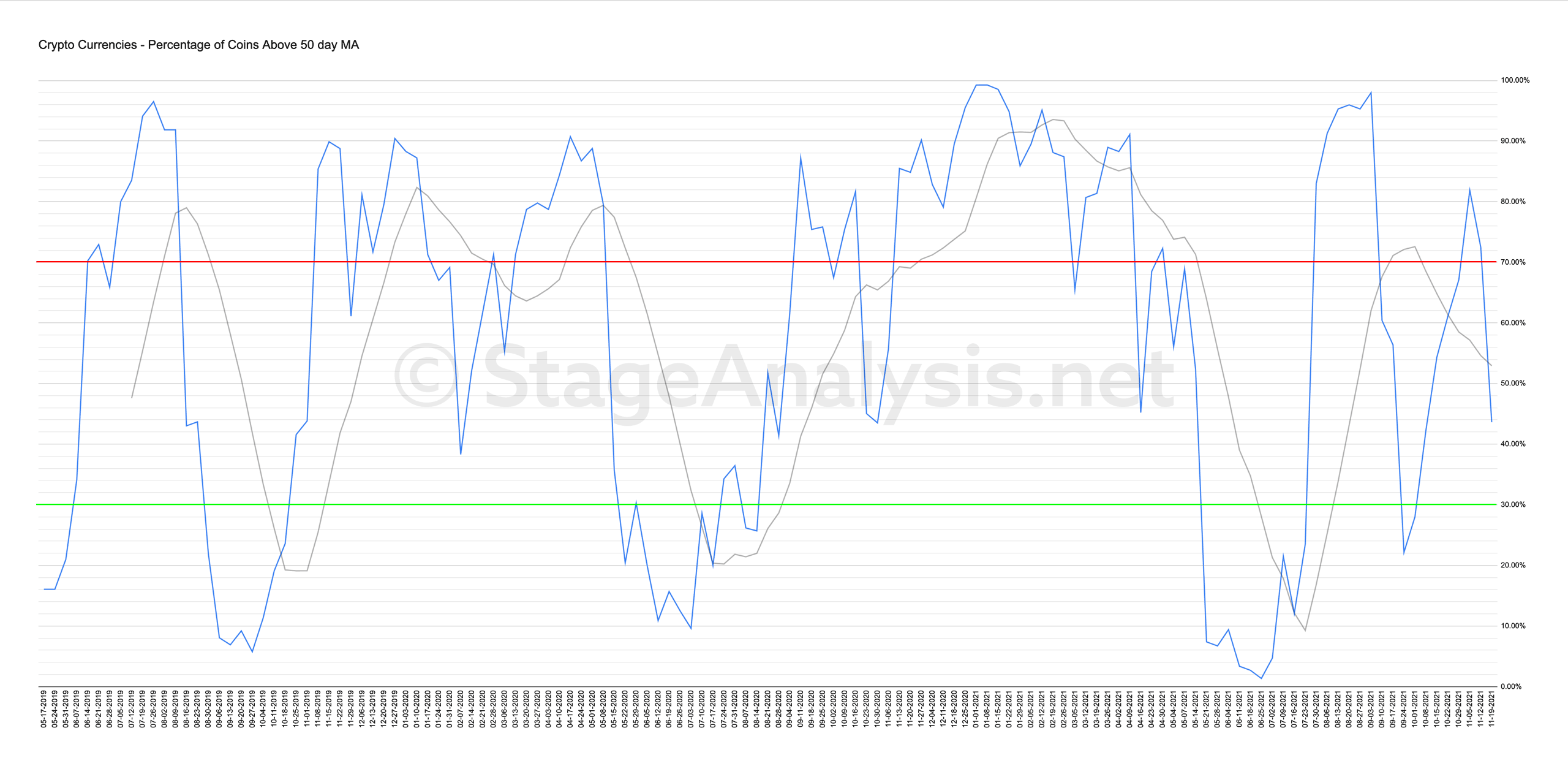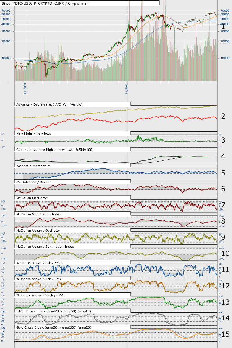 RE: Crypto - isatrader - 2021-11-09 Bitcoin and Ethereum hitting new highs again and Solana isn't far off its highs either. Cardano lagging still after the recent pullback Litecoin - isatrader - 2021-11-09 $LTC.X Litecoin with a breakout attempt from the six month range on strong relative volume. So potentially in the Sign of Strength (SoS) rally in Phase D. $OGN.X Origin Protocol - isatrader - 2021-11-11 $OGN.X Origin Protocol testing the top of the six month base structure. Potentially in Phase D Some crypto altcoins in interesting spots $DBG.X, $HBAR.X, $INJ.X, $NEAR.X, $TVK.X, $OMG.X RE: $MANA.X Stage 2 breakout - isatrader - 2021-11-12 $MANA.X Decentraland coin. Moving on the metaverse theme over the last few weeks and picking up again today after a fairly contained pulled back. I took a small position in my crypto pension account (2021-10-31, 03:55 PM)isatrader Wrote: $MANA.X massive Stage 2 breakout this week on huge all time high volume. Related to Facebooks Meta announcement this week. MANA is decentralized 3D virtual reality platform supported by the Ethereum blockchain. $SAND.X The Sandbox - isatrader - 2021-11-16 $SAND.X The Sandbox showing the RS as the broader cryptos pullback (Metaverse theme) Percentage of Crypto Currencies above their Moving Averages breadth charts - isatrader - 2021-11-21 % Above 20 day MA: 25.83% (-28.53%) % Above 50 day MA: 43.62% (-28.86%) % Above 150 day MA: 72.48% (-12.08%) % Above 200 day MA: 63.58% (-7.56%) Average: 51.38% (-19.26% 1wk) Status: Difficult Environment Here's the individual Percentage of Crypto Currencies above their Moving Averages breadth charts. RE: Crypto Currencies - Bitcoin, Ethereum, Ripple, Litecoin, Cardano & more - pcabc - 2021-11-23 Crypto breadth We are in a bit of a pullback at present across cryptos. My breadth chart is below. Key points: 1. Advance / Decline has diverged. However, Advance / Declining volume (Bitcoin volume only), is at a new high. 3 & 4. New Highs - New Lows is around zero. The cummulative line is flat. Neutral. 5 6. Weinstein Momentum & 1% A/D have both just crossed from positive territory to zero and are falling. Bearish. 7, 8, 9 & 10. The McClellan Oscillator, Summation Index and volume counterparts are all bearish. 11, 12 & 13. The % stocks above their 20, 50 and 200 day EMAs have all dropped, with the % above the 200 day EMA being only just above 50%. 14 & 15. Silver and Gold Cross Indices have rolled over, though rather early to see if the recent rising trend of the Gold Cross Index is reversing or whether this is just temporary. I note Etherium has, as of posting made a +7% move. However, taking Etherium and Bitcoin out the picture the rest of the cryptos are minnows. So how relevant is this breadth plot to Bitcoin and Etherium? I must admit I have been tempted to buy on the dip. However, overall crypto breadth from the chart is looking rather negative so perhaps hold off until things start to strengthen. Of course, it won't strengthen until some start moving up so I will likely miss the first movers. $MANA.X and $SAND.X - isatrader - 2021-11-24 $MANA.X and $SAND.X both with strong moves to new highs today. Continuing to show really strong RS versus the other cryptos currently, based on the metaverse theme. |