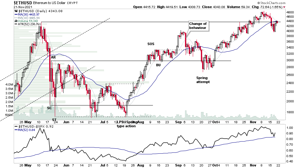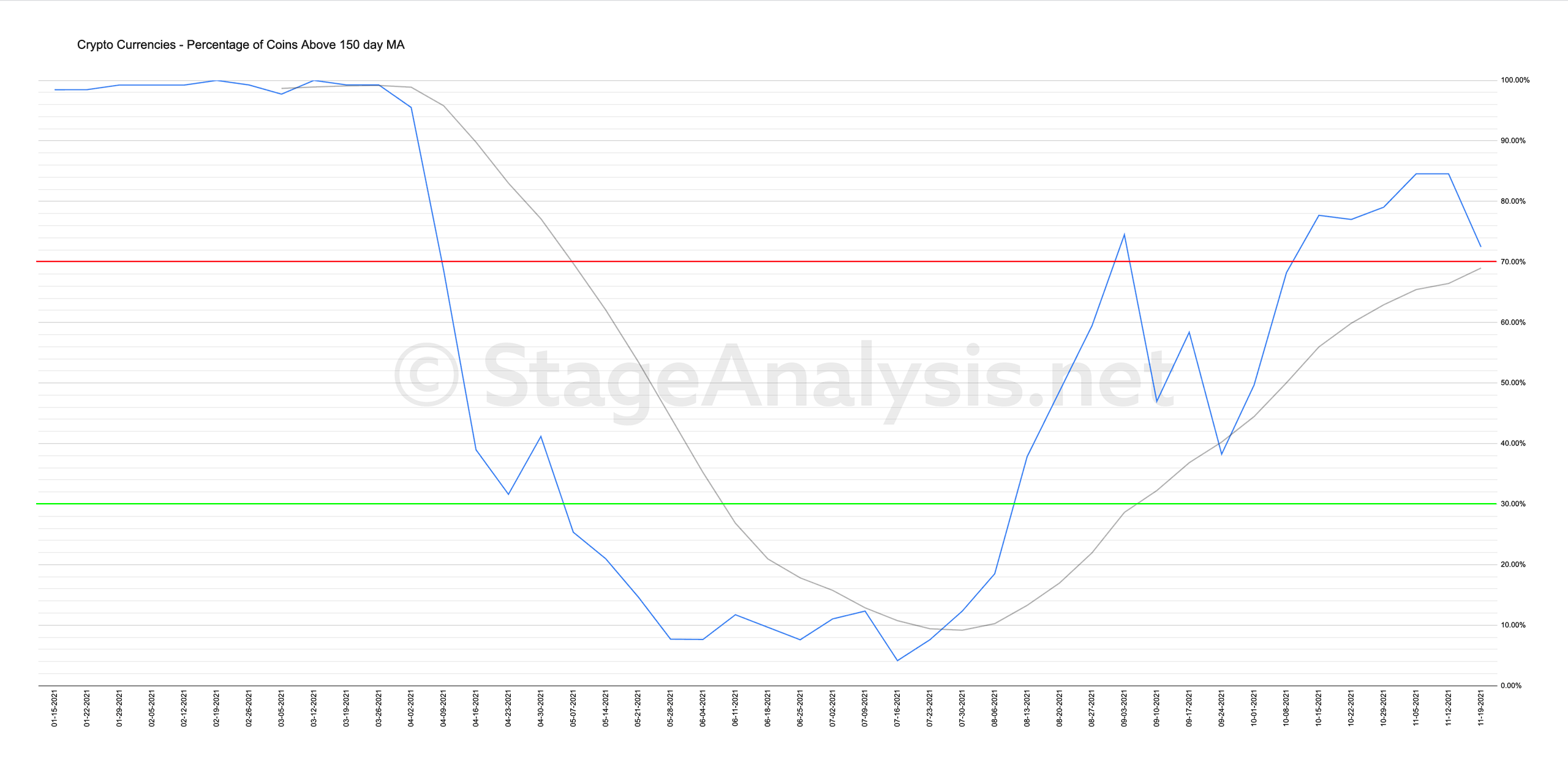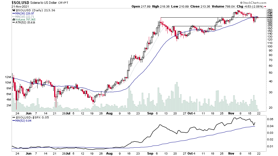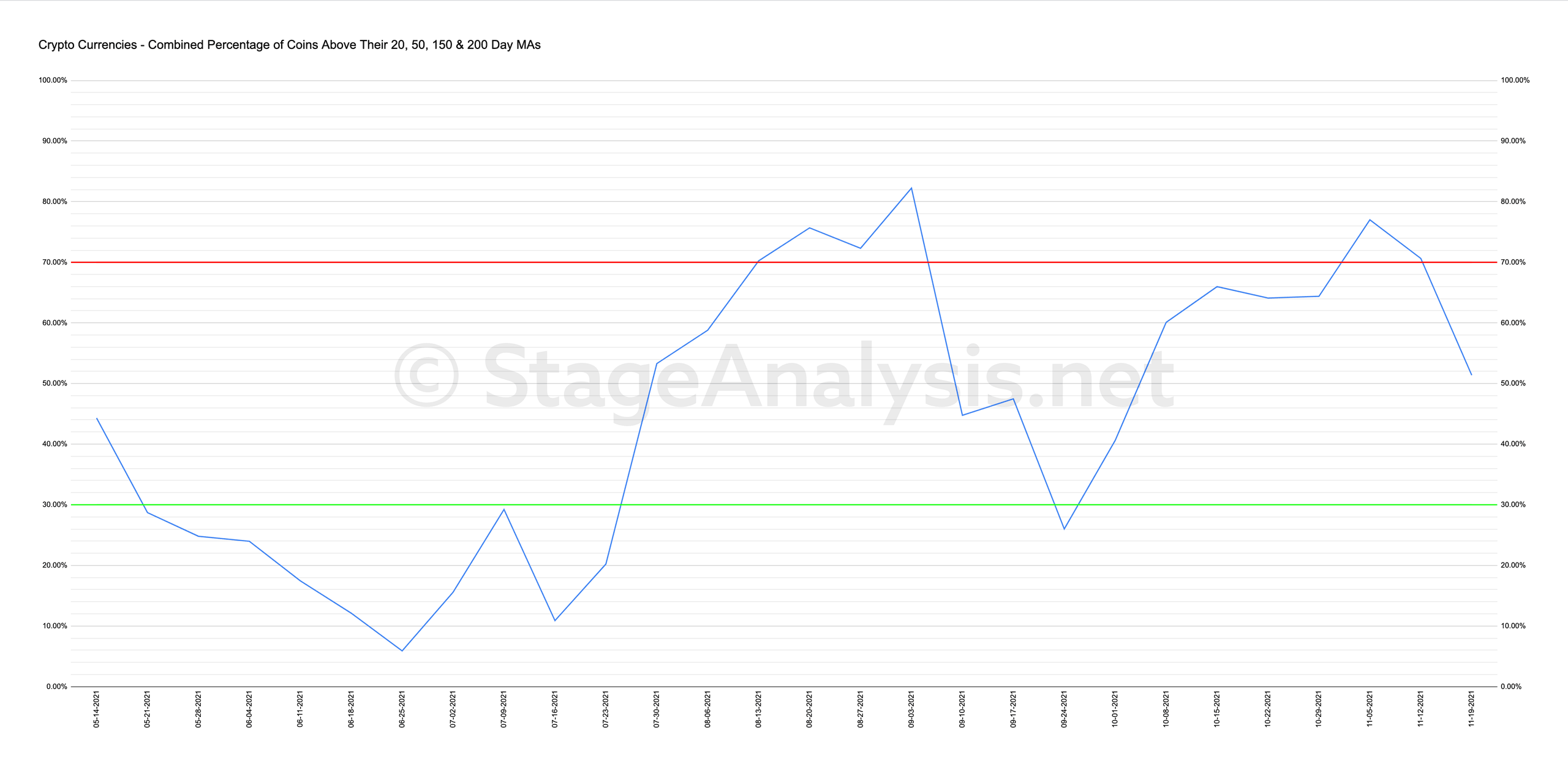 RE: Crypto - isatrader - 2021-11-09 Bitcoin and Ethereum hitting new highs again and Solana isn't far off its highs either. Cardano lagging still after the recent pullback Litecoin - isatrader - 2021-11-09 $LTC.X Litecoin with a breakout attempt from the six month range on strong relative volume. So potentially in the Sign of Strength (SoS) rally in Phase D. $OGN.X Origin Protocol - isatrader - 2021-11-11 $OGN.X Origin Protocol testing the top of the six month base structure. Potentially in Phase D Some crypto altcoins in interesting spots $DBG.X, $HBAR.X, $INJ.X, $NEAR.X, $TVK.X, $OMG.X RE: $MANA.X Stage 2 breakout - isatrader - 2021-11-12 $MANA.X Decentraland coin. Moving on the metaverse theme over the last few weeks and picking up again today after a fairly contained pulled back. I took a small position in my crypto pension account (2021-10-31, 03:55 PM)isatrader Wrote: $MANA.X massive Stage 2 breakout this week on huge all time high volume. Related to Facebooks Meta announcement this week. MANA is decentralized 3D virtual reality platform supported by the Ethereum blockchain. $SAND.X The Sandbox - isatrader - 2021-11-16 $SAND.X The Sandbox showing the RS as the broader cryptos pullback (Metaverse theme) Percentage of Crypto Currencies above their Moving Averages breadth charts - isatrader - 2021-11-21 % Above 20 day MA: 25.83% (-28.53%) % Above 50 day MA: 43.62% (-28.86%) % Above 150 day MA: 72.48% (-12.08%) % Above 200 day MA: 63.58% (-7.56%) Average: 51.38% (-19.26% 1wk) Status: Difficult Environment Here's the individual Percentage of Crypto Currencies above their Moving Averages breadth charts. RE: Crypto Currencies - Bitcoin, Ethereum, Ripple, Litecoin, Cardano & more - pcabc - 2021-11-23 Crypto breadth We are in a bit of a pullback at present across cryptos. My breadth chart is below. Key points: 1. Advance / Decline has diverged. However, Advance / Declining volume (Bitcoin volume only), is at a new high. 3 & 4. New Highs - New Lows is around zero. The cummulative line is flat. Neutral. 5 6. Weinstein Momentum & 1% A/D have both just crossed from positive territory to zero and are falling. Bearish. 7, 8, 9 & 10. The McClellan Oscillator, Summation Index and volume counterparts are all bearish. 11, 12 & 13. The % stocks above their 20, 50 and 200 day EMAs have all dropped, with the % above the 200 day EMA being only just above 50%. 14 & 15. Silver and Gold Cross Indices have rolled over, though rather early to see if the recent rising trend of the Gold Cross Index is reversing or whether this is just temporary. I note Etherium has, as of posting made a +7% move. However, taking Etherium and Bitcoin out the picture the rest of the cryptos are minnows. So how relevant is this breadth plot to Bitcoin and Etherium? I must admit I have been tempted to buy on the dip. However, overall crypto breadth from the chart is looking rather negative so perhaps hold off until things start to strengthen. Of course, it won't strengthen until some start moving up so I will likely miss the first movers. $MANA.X and $SAND.X - isatrader - 2021-11-24 $MANA.X and $SAND.X both with strong moves to new highs today. Continuing to show really strong RS versus the other cryptos currently, based on the metaverse theme. |