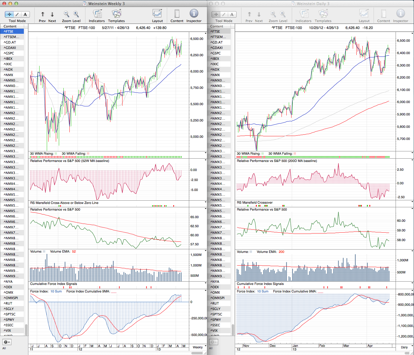 Major Stock Indexes Update - isatrader - 2013-04-21 Attached is the updated major equity index charts and relative performance table. US Stock Indexes The S&P 500 has taken the top spot in the relative performance table for the first time since I've been following this over the last year or so. However, as you'll see on the chart it isn't necessarily a good thing as it appears to be losing momentum, as the 30 week WMA momentum line turned neutral and is close to crossing it's 10 week MA which I use for a signal line. And the detrended distance above the 30 week WMA also broke down below it's recent swing lows, as did the momentum index and so it's looks to be showing signs of forming a Stage 3 top, although it's the strongest of the major US charts I follow. The Russell 2000 small caps index also looks to be forming a Stage 3 top with the price closing well below the 50 day MA which has started to rollover. However, it needs to close a week below the previous swing low of 894.24 to complete the Stage 3 top, although it would still be above a rising 30 week MA. European Stock Indexes The German Dax broke down into Stage 4A, but is very close to it's 200 day MA and so there's a chance of a bounce to retest the breakdown level. Relative performance versus the S&P 500 has been below the zero line for four weeks now and the cumulative volume closed below it's signal line this week as well. The measured swing target imo is down to the 7000 level. The FTSE 100 is also close to completing a Stage 3 top, but looks relatively stronger than the Dax as it's still quite far above it's 200 day MA, and the 30 week MA is still rising. Commodities Update and the Dollar Index - isatrader - 2013-04-21 Attached is the updated major commodities charts, Gold (GC), Copper (HG), West Texas Intermediate Crude (CL) which are all now in Stage 4 and the Dollar Index (DX) which is in Stage 2 consolidation phase imo. US 10 & 30 Year Treasuries - isatrader - 2013-04-21 Attached is the updated US 10 & 30 Year Treasuries charts which are currently in Stage 1A imo. US Industry Sectors - isatrader - 2013-04-21 Attached are the updated US Industry Sector Charts and relative performance table. Health Care (XLV) retained the top spot this week followed by Consumer Staples (XLP) in second place. Utilities also closed the week at a new high and remain above the S&P 500 in the table. So the defensive sectors are strengthening still while money is leaving some of the previous leaders like Industrials (XLI) and Financials (XLF) NYSE Percentage of Stocks above their 50 day MA - status change - isatrader - 2013-04-23 The short term NYSE Percentage of Stocks above their 50 day Moving Averages chart has put in a new double top buy signal, moving it back to Buy Confirmed status in the middle of the range. However, the line chart is still in a downtrend below it's own declining 50 day MA, and the relative performance versus the S&P 500 is still below it's 200 day MA as you can see on the chart, so it's not got much confirmation. RE: Stan Weinstein's Stage Analysis - Discussion Thread - goodtyneguy - 2013-04-28 Major Stock Indexes Update - isatrader - 2013-04-28 Attached is the updated major equity index charts and relative performance table. US Stock Indexes European Stock Indexes |