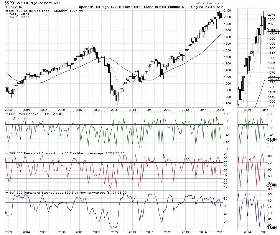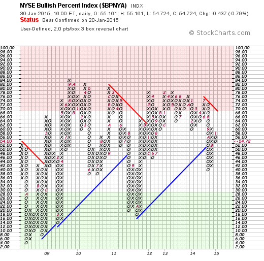 Dow Jones US Sub Sectors Performance - isatrader - 2015-01-31 Attached is the US Sub Sectors ordered by the weekly and monthly percentage change. To see the full list sectioned by major sector, with links through to individual stocks in each sector, go to: http://stockcharts.com/freecharts/industrysummary.html?&V=W&G=SECTOR_SPDR Weekly US Sector Relative Performance Monthly US Sector Relative Performance RE: Stan Weinstein's Stage Analysis - isatrader - 2015-01-31 Attached is the monthly US equity index charts for the major US indexes to help give a bit of long term perspective to the current market. US Stock Indexes US Industry Sectors Breadth - isatrader - 2015-01-31 Below is the data table for the Percent of Stocks Above 150 Day Moving Average in each sector which I've ordered by relative strength, with the highest to the lowest percentage in each sector. Also attached is the visual diagram of the 9 sectors and the NYSE Percentage of Stocks above their 150 day Moving Averages line chart. NYSE Market Breadth Update - isatrader - 2015-01-31 Attached is the NYSE Bullish Percent Index and the NYSE long, medium and short term moving average breadth charts. The NYSE Bullish Percent Index NYSE Percentage of Stocks above their 200 Day, 150 Day and 50 Day Moving Averages P&F charts NYSE Percentage of Stocks above their 200 Day, 150 Day and 50 Day Moving Averages line charts NYSE Advance Decline Breadth Charts - isatrader - 2015-01-31 Attached is the updated Advance Decline Breadth Charts, including the cumulative AD line, momentum index, cumulative AD volume line, 10 Day AD oscillator and the McClellan Oscillator and Summation Index. NYSE New Highs New Lows - isatrader - 2015-01-31 Attached is the New Highs / New Lows charts. S&P 500 Cumulative P&F Breakouts - Breakdowns - isatrader - 2015-01-31 Attached is the exclusive S&P 500 Cumulative P&F Breakouts - Breakdowns charts Nasdaq Breadth Charts Update - isatrader - 2015-02-01 The Nasdaq Bullish Percent Index Nasdaq Percentage of Stocks above their 200 Day, 150 Day and 50 Day Moving Averages P&F charts Nasdaq Percentage of Stocks above their 200 Day, 150 Day and 50 Day Moving Averages line charts Nasdaq Advance Decline Line Nasdaq New Highs New Lows |