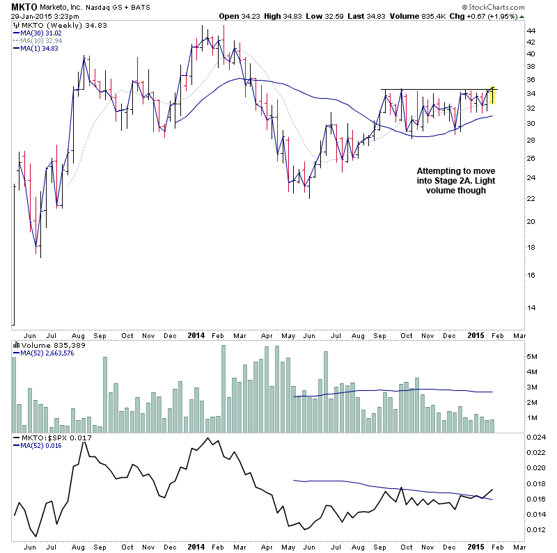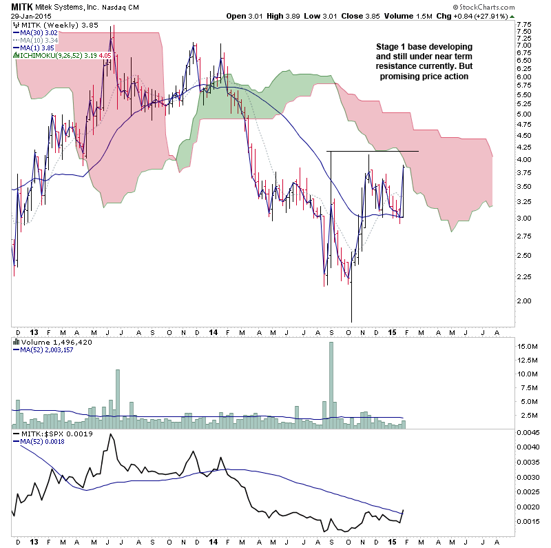 RE: US Stocks - Watchlist and Discussion (Premium) - Lplate - 2015-01-29 (2015-01-28, 09:31 PM)isatrader Wrote:Yes I understand that to keep a reasonable workload and system it is best to look only at the scan itself,because a full "could be later" watchlist would be too many to handle.(2015-01-28, 06:46 PM)Lplate Wrote: It is a dilemma, isn't it, how much time to spend on potential future candidates way before they trigger on a scan The other point about this stock is that the turnaround was in the 3rd week of Dec, which would be a low volume week anyway. RE: US Stocks - Watchlist and Discussion (Premium) - isatrader - 2015-01-29 A few for the US watchlist from the intraday scans - ALV, CSII, HAR RE: US Stocks - Watchlist and Discussion (Premium) - isatrader - 2015-01-29 MKTO - Attempting to breakout into Stage 2A on light volume. Gold stocks with strong relative performance $GLD $GOLD - isatrader - 2015-01-30 I'm still monitoring some of the gold stocks with the strongest relative performance, as I'm already in the one of the strongest - RIC.TO (listed under RIC in the US market), and so am considering a second position in one of the other best looking candidates imo. Gold has pulled back to the 200 day MA today, and so we are seeing some consolation in these leading gold stocks, after a very strong start to the year. So there could be an opportunity for an entry point in the coming days / weeks on either a further pullback or continuation breakout in some of these or other leading gold stocks. KDX.TO GFI SBGL WDO.TO CG.TO RE: US Stocks - Watchlist and Discussion (Premium) - isatrader - 2015-01-30 MITK - Stage 1 base developing and still under near term resistance currently. But promising price action. RE: US Stocks - Watchlist and Discussion (Premium) - Amedee - 2015-01-30 (2015-01-29, 09:25 PM)isatrader Wrote: MKTO - Attempting to breakout into Stage 2A on light volume. I hope the volume will come today , my buy stop was triggered @35.11 so I am in with half position. I like the long consolidation base: it gives me a PO (price objective on the horizontal count) of 56 on the 1BR and 3BR (1 box reversal and 3 box reversal) chart and a RR of 5 (my SL is @30.87).RE: US Stocks - Watchlist and Discussion (Premium) - isatrader - 2015-01-30 A few for the US long watchlist from the intraday scans - HLIT, TROV, CCMP, CPRX, CPHD, AMZN RE: US Stocks - Watchlist and Discussion (Premium) - isatrader - 2015-01-31 CRMD - Attempting to make a Stage 2 continuation with heavy relative volume. |