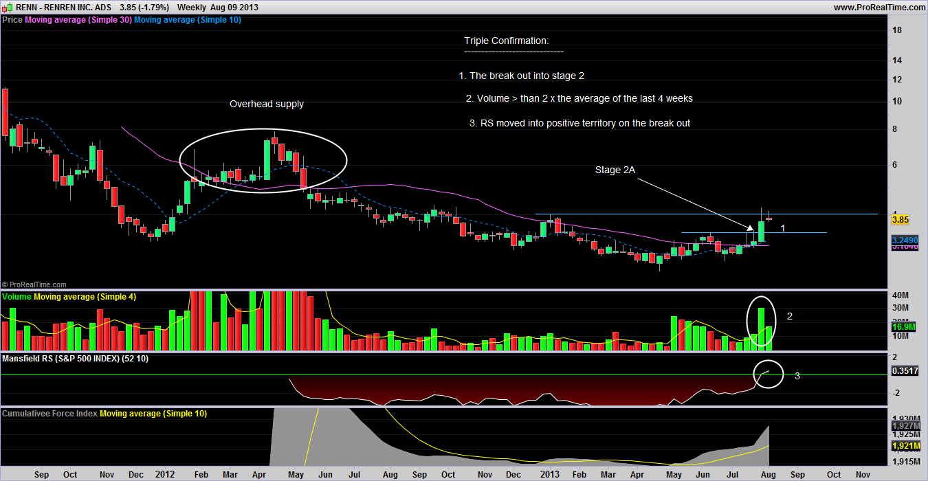 RE: Watchlist - Traders method - goodtyneguy - 2013-08-11 (2013-08-09, 02:17 PM)gbarbs Wrote: goodtyne - i own some cbst and renn. i liked your others as well just have to wait for closer stops. It was your earlier posts with potential candidates in the biotech/pharma which prompted me to look at theses industries. Well done for getting into RENN (China's Facebook I believe), on the break out into stage 2A I presume. The chart has a great look about it in my opinion and it's the nearest live chart I've seen to the triple confirmation pattern on page 148 of SFPIBABM. There is some overhead supply to get through but it should be blown through if the volume comes in as expected of this pattern. I'm hoping to be able to get in either as a continuation buy on the break out of 4.24 or I may buy if I get a pocket pivot purchase opportunity. Good luck with both of them. EDIT: Anyone know where I can get a list of the constituents of the DJ US sub sector indices? I tried on their site but could only see fact sheets for the sector indices. RENN is described by google as being a social media and networking stock and there are four DJ US sub sectors with media in their title. RE: Watchlist - Traders method - isatrader - 2013-08-11 (2013-08-11, 07:39 PM)goodtyneguy Wrote: Anyone know where I can get a list of the constituents of the DJ US sub sector indices? I tried on their site but could only see fact sheets for the sector indices. RENN is described by google as being a social media and networking stock and there are four DJ US sub sectors with media in their title. Stockcharts has them here: http://stockcharts.com/freecharts/sectorsummary.html - click throught the major sectors to see the DJ US sub sectors, and then click those to see the constituents of each. RENN is in Cyclicals / Special Consumer Services. See here: http://stockcharts.com/freecharts/sectorsummary.html?&V=E&S=1&D=0&G=SECTOR_DJUSCS When you are in a chart in stockcharts you can click the "full quote" button under the chart to get the sector info to show on the chart. RE: Watchlist - Traders method - goodtyneguy - 2013-08-11 (2013-08-11, 08:32 PM)isatrader Wrote: Stockcharts has them here: http://stockcharts.com/freecharts/sectorsummary.html - click throught the major sectors to see the DJ US sub sectors, and then click those to see the constituents of each. Aah great, thanks Isa. I learnt something new today. On a different note, you don't happen to know of a diagnostics tool (software) to test a graphics card do you? RE: Watchlist - Investor method - goodtyneguy - 2013-08-11 Cotton looks poised to break out into stage 2A with just a little near term resistance to overcome. Worth watching the price action to see if it sets up a pivot low below the break out level for a good R2R ratio for a trader play to the near term resistance. An investor play with a stop below the 40 dma would have a low risk of approx. 2.45 times the ATR200. I brought this one up in post 110 (HAWK.L) and said it had a good looking chart. It broke out on high volume the day after and even at this level is a low risk entry for an investor play. Also worth watching for a pull back entry near to the break out level. At under 9p a share it's worth a punt at what could be a gain of a few hundred percent of its purchase price. RE: Watchlist - Investor method - gbarbs - 2013-08-13 HAWK looks attractive but i don't have the ability to purchase shares on the london exchange. very good looking chart though. added cotton to my watchlist. thanks. RE: Watchlist - Traders method - gbarbs - 2013-08-13 i wish i could say i got into RENN on the breakout but not so. I think i intially noticed the chart when scanning top 10 market movers. i'll run through those typically to find breakouts and then watch for pullbacks (always check the sector/group though). recently, i have stayed away from some good looking charts because stops were too far away (which happens when you miss the breakout). then they just keep going higher and higher. so, i decided to just buy a little so that if the stock price does drop back a large %, its still a small % against my portfolio. and at that point can add a normal size position at a safer level. if it does continue rising, then i get to take part and rewarded for finding it. weinstein i think made reference to this in one of the interviews posted on this site? about getting in and out in increments rather than all at once. this makes a lot of sense to me. on the sell side i have split up stops between trendlines and swing lows, which is one method he recommends in the book. on the buy side i find it difficult to catch breakouts on the breakout. if i have 20 on my watchlist for example i don't have 20 buy stop orders sitting in place. so i am trying to stay patient for the safest entries on majority of purchases but allowing some for the best looking charts even if they are far from support. having said that, i am into RENN at 3.95. noticed DGIT up a large amount today. looks like this broke out last week - missed that one RE: Watchlist - Traders method - gbarbs - 2013-08-13 SMT charts attached. Broke out and pulling back. Still pretty far from a close stop. I see 1.74 as closest valid stop point which is about 17% from 2.10 where it is as I post this. MA leveled out in April and just started ticking up last month. Volume was very high on breakout. RE: Watchlist - Investor method - isatrader - 2013-08-13 The technical attributes of AKS has gone a score of 1 out of 9, to a 4 out of 9 this week currently, with the 30 week weighted MA turning up, signalling that it's consolidation of the last four months is now forming a Stage 1 base. So one to watch for a breakout after a two year Stage 4 decline. |