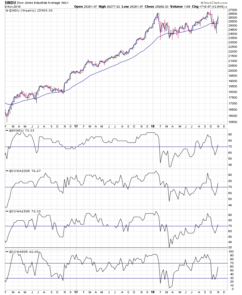 Cumulative P&F Breakouts - Breakdowns custom Breadth charts - isatrader - 2018-11-10 Attached is my updated custom breadth charts that I do based on the daily point and figure double top breakouts and double bottom breakdowns. Totals for the week: +492 double top breakouts -339 double bottom breakdowns +153 net breakouts RE: Major US Stock Indexes Update - NYSE, Nasdaq, S&P 500, DJIA & S&P 600 small caps - isatrader - 2018-11-10 Here's the overview charts of the US Bullish Percent and Moving Average Breadth. NYSE and Nasdaq Market Breadth Update - isatrader - 2018-11-10 Attached is the NYSE Bullish Percent Index and the NYSE long, medium and short term moving average breadth charts. The NYSE and Nasdaq Composite Bullish Percent Indexes NYSE Percentage of Stocks above their 200 Day, 150 Day and 50 Day Moving Averages P&F charts Nasdaq Composite Percentage of Stocks above their 200 Day, 150 Day and 50 Day Moving Averages P&F charts Advance Decline Charts and US New Highs New Lows - isatrader - 2018-11-10 Attached is the updated NYSE Advance Decline Breadth Charts, including the cumulative AD line, momentum index, cumulative AD volume line, 10 Day AD oscillator and the McClellan Oscillator and Summation Index. Attached is the updated US New Highs - New Lows Charts US Sectors - Percent of Stocks Above their 150 Day Moving Average - isatrader - 2018-11-11 Below is the Percent of Stocks Above their 150 Day Moving Average table in each sector, which is ordered by overall health. Also attached is the visual diagram of the 9 sectors and the two major exchanges that make up the sectors that shows a snapshot of the overall health of the US market. Note: the overall sector average is at 36.29% currently and gained +8.67% since my last update two weeks ago. RE: Stan Weinstein's Stage Analysis - grbaNT - 2018-11-11 Attached are the updated charts of the RABWDB Indicator, Individual Phases, SP500 RABWDB, SP400 RABWDB and SP600 RABWDB. Quick description of the indicator: Sample is the same as for the Survey (2287 stocks). Stock classification is done as per Chuck Dukas's TrendAdvisor Diamond described in his book (see attached TrendAdvisor Diamond). Stocks in bullish, accumulation and recovery phases are considered healthy and cumulatively plotted as an oscillator, same as in the Survey. Those in warning, distribution and bearish phases are considered technically unhealthy. RE: Stan Weinstein's Stage Analysis - grbaNT - 2018-11-11 Attached are the updated charts of the US Stock Market Survey Indicator, Individual Stages, SP500 Survey, SP400 Survey and SP600 Survey. If you want to read my commentary, please go to https://dg-swingtrading.blogspot.com/search/label/Market%20Breadth To learn more about the indicator go to https://dg-swingtrading.blogspot.com/2018/02/stan-weinsteins-us-stock-market-survey.html RE: Stan Weinstein's Stage Analysis - isatrader - 2018-11-11 Another set of breadth charts I thought was interesting at the moment is the effective volume charts of some of the major US ETFs, which shows the large player and small player volume, and the combined charts from  http://www.effectivevolume.com/content.php?156-etf-review Shows institutional money coming back into the Nasdaq 100 ETF over the last few weeks, but much less so in the SPY and IWM, although they have stabilised and are around their 20 day MA currently. Something slightly different to add to the breadth posts this week. I received the following email from Mark Minervini's website on Friday with a bit of his commentary on the current market condition. So thought I'd share it on here too. |
