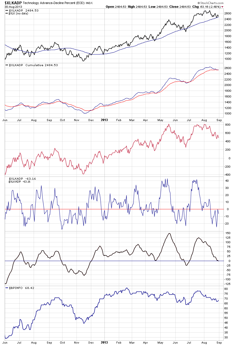 Commodities Update and the Dollar Index - isatrader - 2013-08-31 Attached is the updated major commodities charts, Gold (GC), Copper (HG), West Texas Intermediate Crude (CL) and the Dollar Index (DX). US 10 & 30 Year Treasuries - isatrader - 2013-08-31 Attached is the updated US 10 & 30 Year Treasuries charts. US Industry Sectors - isatrader - 2013-08-31 Attached are the updated US Industry Sector Charts and relative performance table. Relative performance monthly charts - isatrader - 2013-08-31 Here's the updated S&P 500 monthly relative performance charts versus the Continuous Commodities Index ($CCI) and Gold ($GOLD), which shows that stocks underperformed both for the first time this year. US Industry Sectors Advance Decline Charts - isatrader - 2013-08-31 To go into even more depth on the individual sectors, attached is a number of different measures based around the advance decline data for each major sector. Below is the charts: XLB, XLE and XLF XLI, XLK and XLP XLU, XLV and XLY US Sub Sector Relative Strength - isatrader - 2013-09-01 An important part of Weinstein's Stage Analysis method is sector analysis, so attached is the relative strength lists of the US sub sectors that they produce on chartmill.com - which I've ordered by strongest #1 - which is Office Supplies to the weakest #212 - which is Nonmetallic Mineral Mining These sectors are Chartmill's own categorisation, so they don't necessarily all match the Dow Jones US sub sectors, as they've divided them into more sectors than the Dow Jones Indexes have. However, to see the components of each sector go to: http://www.chartmill.com/sectorrankings.php?r=1&t=C2&s=0 and click on the name of the sector. To order the list by the Average Relative Strength of each sector you need to select the drop down menu called "Order by" and select Average Relative Strength (DESC) US Industry Sectors Breadth - isatrader - 2013-09-07 A modest up week on the sector breadth this week, with all sectors rebounding after last weeks strong negative tone. Below is the data table for the Percent of Stocks Above 150 Day Moving Average in each sector which I've ordered by relative strength, with the highest to the lowest percentage in each sector. Also attached is the visual diagram of the 9 sectors and the NYSE Percentage of Stocks above their 150 day Moving Averages line chart. RE: Market Breadth - isatrader - 2013-09-07 Attached is the NYSE Bullish Percent Index and the NYSE long, medium and short term moving average breadth charts. The NYSE Bullish Percent Index NYSE Percentage of Stocks above their 200 Day, 150 Day and 50 Day Moving Averages P&F charts NYSE Percentage of Stocks above their 200 Day, 150 Day and 50 Day Moving Averages line charts |