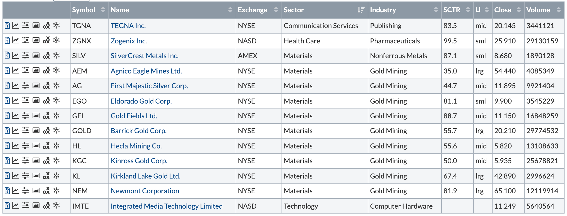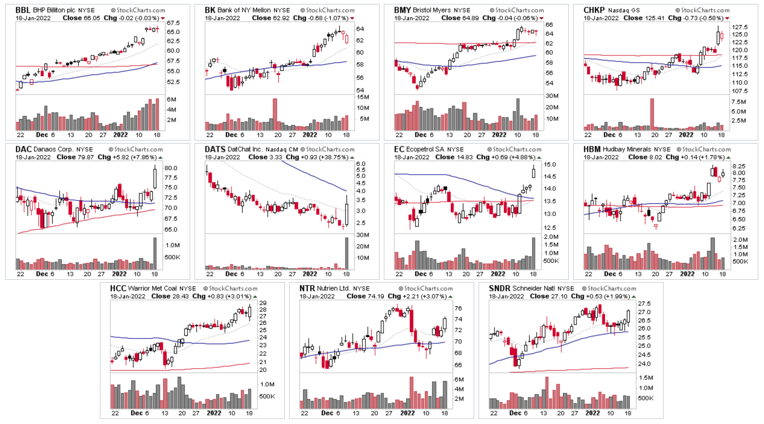 US Stocks Watchlist - 13 January 2022 - isatrader - 2022-01-14 ➜ For the watchlist from Thursdays scans: AKR, AMCR, BANR, BC, BMY, CAT, CBZ, DE, EQNR, JOAN, KBH, KRG, MDC, SAVE, The watchlist scans were again dominated by financials and more defensive areas of the market. But on the negative of things tech growth stocks continue to act poorly. For the individual daily charts go to the private twitter channel at: https://twitter.com/Stage_Analysis/status/1481763699450855428 Friday 14 January 2022 - isatrader - 2022-01-14 Energy leading so far today again with the bulk of the sectors negative. $JPM reacting negatively to earnings, puling back to the 200 day MA, which is weighing on the financials today. $ENQR from the watchlist and in the energy sector making the Stage 2 continuation breakout attempt $SM from the watchlist and also in the energy sector moving above the near term pivot and towards the highs. $LVS with a significant bar gap up within the range on Goldman Sachs commentary Stage 2 breakout attempts - isatrader - 2022-01-16 A few of the weeks Stage 2 breakout attempts on more than 2x average weekly volume - $BBL, $KBH, $TSM One of the standouts of the week was $ZIM from the watchlist, which made a Stage 2 continuation breakout to new highs on strong relative volume. US Stocks Watchlist - 16 January 2022 - isatrader - 2022-01-16 ➜ For the watchlist from the weekend scans: ABBV, AMAT, AMKR, ARLP, ARW, ATC, AVT, BKR, BKU, BTU, CEIX, CMRE, DE, GSL, GXO, INFY, ISBC, KBH, KEY, LVS, MKSI, MTDR, MU, NS, OMAB, ON, ONTO, OZK, PGR, PLAB, QCOM, SLCA, SM, TRTN, WYNN, XPEV, A few group themes of note in the weekend watchlist scans - Semiconductors, Transportation Services, Coal, Banks, Energy groups, Gambling. US Stockmarket is closed on Monday, but Earnings Season kicks off this week again with some major Banks first up reporting on Tuesday. For the individual daily charts go to the private twitter channel at: https://twitter.com/Stage_Analysis/status/1482691318195404801 I'll go through the watchlist stocks in more detail later on in Part 2 of the weekend video. Tuesday 18 January 2021 - isatrader - 2022-01-18 Good morning. Pre-market looking heavy so far except in a few areas like energy and silver. Will be watching for areas of relative strength and red to green moves today. Energy turning negative too. $XLF now a "failed" Stage 2 continuation breakout with todays Reversal Significant Bar back into the recent range. $GS with an earnings gap Stage 4 breakdown today which will be a Significant Bar. Short squeeze in $DATS today as it puts in a potential selling climax in Stage 4. So could be the start of a potential base. US Stocks Watchlist - 18 January 2022 - isatrader - 2022-01-18 ➜ For the watchlist from Tuesdays scans: BBL, BK, BMY, CHKP, DAC, DATS, EC, HBM, HCC, NTR, SNDR, With a down day across 10 of the 11 sectors today, it's a fairly thin day for the watchlist. For the individual daily charts go to the private twitter channel at: https://twitter.com/Stage_Analysis/status/1483569814144794630 Wednesday 19 January 2021 - isatrader - 2022-01-19 S&P 500 with spring type action from the open today after yesterdays undercut of the recent swing low. Will be observing the strength of the bounce attempt and whether it can recover the short term MAs. If not, then they could become further areas to re-short. Gold $GLD breaking above the near term pivot within its broader weekly Stage 1 base Silver $SLV also breaking above it's near term pivot as it attempts to base See recent blog post on gold and silver: https://www.stageanalysis.net/blog/88434/gold-and-silver-stage-analysis $GDX Gold Miners ETF attempting to breakout in from potential early Phase C (LPS) structure, and the Junior gold miners too $GDXJ Silver stocks also catching a bid with the move in gold i.e. $HL, $EXK $GATO, $SILV etc. So could be worth further research. 20 year Nasdaq Composite chart with percentage of stocks above their 200 day MA, 150 day MA and 50 day MA underneath for comparison to past periods Highlighted areas are when 200 day MA was below 30% level. Red line is current level in each. Noticing numerous significant bars in the gold and silver miners charts today. So I ran the Significant Bar scan to to see what was coming up in that and unsurprisingly 10 out the 13 results currently are gold or silver miners. US Stocks Watchlist - 19 January 2022 - isatrader - 2022-01-19 ➜ For the watchlist from Wednesdays scans: AEM, AG, AU, AUY, BTG, CCK, CEF, CME, CTXS, EGO, EKX, FNV, GATO, GDX, GDXJ, GFI, GLD, GOLD, HL, JBHT, KGC, KL, NEM, NG, PAAS, SBSW, SEE, SILV, SLV, VIV, WPM, With the market down there is a dominant theme today in the watchlist stocks with 3/4 of the stocks from the precious metals groups with numerous stocks in the group having significant bars today and gold itself in late Stage 1, which I posted about at the weekend. So on watch. For the individual daily charts go to the private twitter channel at: https://twitter.com/Stage_Analysis/status/1483924397907976199 |