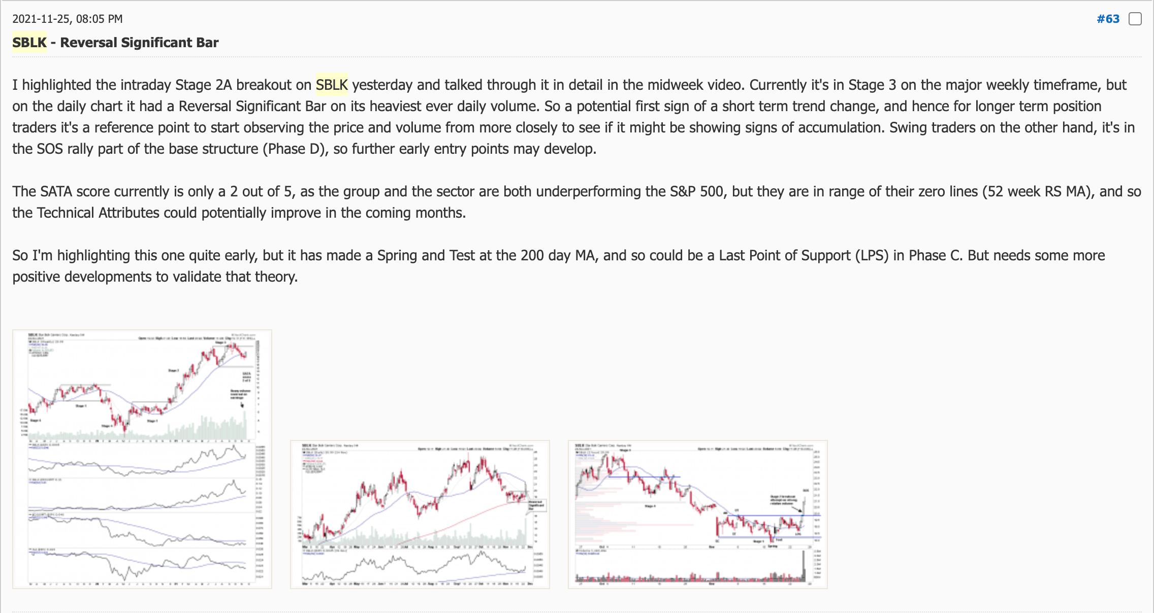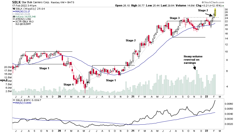Wednesday 16 February 2022 - isatrader - 2022-02-16 The weighting is mostly to the downside from some of todays/yesterdays earnings: UPST (+30%) RBLX (-23%) SHOP (-16%) TTD (-9%) WIX (-23%) ZI (-7%) $KSCP with a continuation attempt following the short covering rally on heavy volume on the 14th. https://twitter.com/Stage_Analysis/status/1493279952158007297 Gold miners also moving again today, + $GOLD gapping to new near term highs on earnings results $UPST holding up well into the end of the day with its highest ever volume day and +34% currently. So will be an Earnings Gap Significant Bar today, and potential change of behaviour.https://twitter.com/Stage_Analysis/status/1493698942848180235 102 stocks reporting after the close today $NVDA, $CSCO, $AMAT, $DASH, $SBLK, $TRIP Nasdaq & NYSE Bullish Percent Index 1 hour chart closing in on the 30 bar MA once more. So potential to move back to positive status tomorrow if a strong move through. US Stocks Watchlist - 16 February 2022 - isatrader - 2022-02-16 ➜ For the watchlist from Wednesdays scans: AER, ALC, ALKS, ATSG, CINF, IONQ, KHC, L, LITM, LTHM, NI, OC, RMBS, SFL, UNVR, UPST, For the individual daily charts go to the private twitter channel at: https://twitter.com/Stage_Analysis/status/1494075528063684614 Thursday 17 February 2022 - isatrader - 2022-02-17 Gold stocks leading from the open this morning, with further weakness in the stock market Gold - Stage 2 breakout? - isatrader - 2022-02-17 Physical Gold attempting a Stage 2 breakout RE: US Stocks Watchlist - isatrader - 2022-02-17 Nasdaq 100 in a dangerous spot with todays move from what could be considered a bear flag. The positive would be that it is still within the broader range that's been developing. But is within striking distance of the weekly Stage 4 breakdown level. Nasdaq & NYSE Bullish Percent Index 1 hour chart couldn't recover the 30 bar MA level and continued to roll lower today below the MA. So has moved from neutral status to negative status today $SBLK reported earnings yesterday, and I wanted to highlight it is a really good example. I've included my original thoughts on it back from 25th Nov when it had a Reversal Significant Bar on heavy volume, and so you can see how the structure develop since then and breakout move. With todays earnings move it's getting extended now in the short term, so from an investor point of view I'd be watching for the next basing action and whether it develops in a constructive way. US Stocks Watchlist - 17 February 2022 - isatrader - 2022-02-18 ➜ For the watchlist from Thursdays scans: ABC, ATO, BP, BTU, Watchlist, GNK, HWKN, KO, MO, MPLX, MRC, OKE, PBF, PM, PXD, SD, SEE, SHLX, SLCA, SOI, VC, WAB, For the individual daily charts go to the private twitter channel at: https://twitter.com/Stage_Analysis/status/1494454766231072768 Gold stocks dominated the watchlist scans tonight, as lots of big moves in the group today with physical gold attempting a major weekly Stage 2 breakout. But I haven't highlighted anymore today, as they've all be covered multiple times over the last few weeks in the watchlists. Friday 18 February 2022 - isatrader - 2022-02-18 Materials stocks from the last few watchlists leading today RE: US Stocks Watchlist - isatrader - 2022-02-18 Nasdaq Composite dropping back into the lower half of the range today with continued uncertainty from world events. But technically it is still within the broader recent trading range in Phase B, so remains in the chop. Gold stalling today at 1900 level on spot price, and near to the top of the broader Stage 1 base. So although technically a potential Stage 2 breakout as it's cleared the bulk of the base pivots, it's too close to May top to call it imo. So I'll give it Stage 1B+ rating for now. Silver is attempting to hold above the 30 week MA within the 1 year downtrend channel, so is still making an attempt to move into Stage 1. So would still only give it a fledgling Stage 1A rating. But if Gold breaks out into Stage 2, then Silver usually follows. |