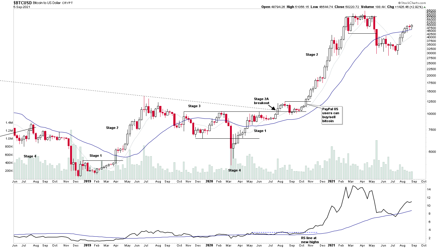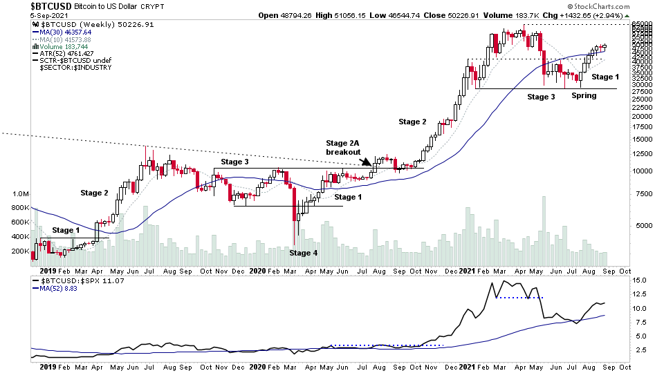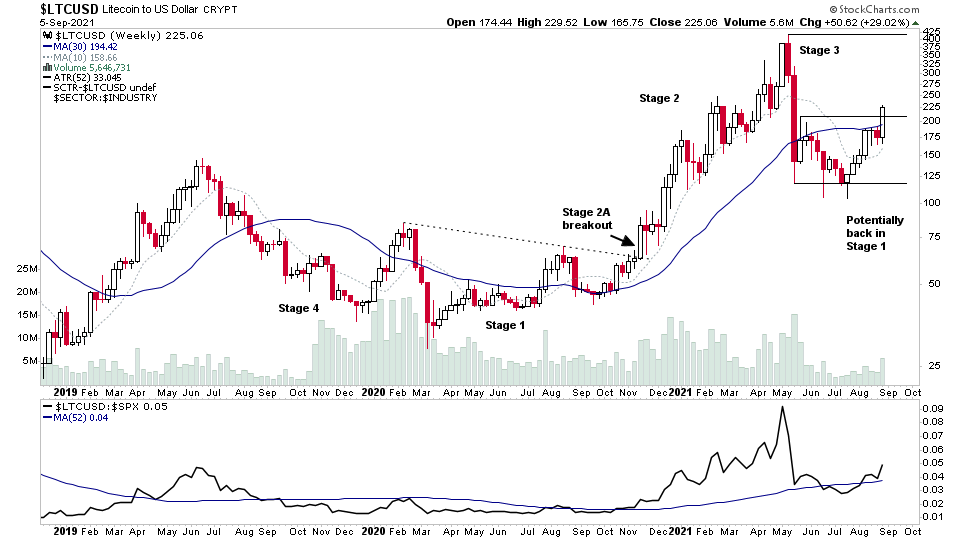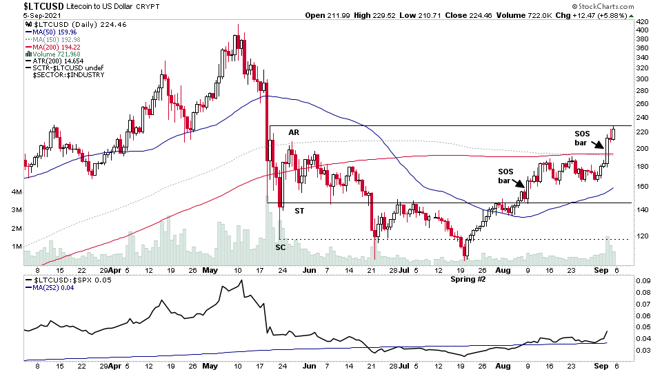 Bitcoin - Potential for Stage 2 breakout attempt - isatrader - 2021-09-05 Bitcoin is also tightening up after the last few weeks around the 50k level. Potential to move back into Stage 2 on the weekly on a strong breakout move. Litecoin - isatrader - 2021-09-05 Litecoin on the comeback trail with a strong push through the 200 day MA on heavy volume in the last few days towards the top of the four month range and attempting to make a continuation breakout on the intraday 4hr timeframe, and testing the top of the range on the daily. But failing to commit above so far. So evidence of supply increasing too. RE: Crypto - pcabc - 2021-09-05 Paypal Interesting development, on logging into Paypal I now, if I do the appropriate setup, I can apply to buy and sell a limited range of cryptos. I'd seen this discussed in the news lately. I've not tried setting this up. No wallet functionality. I wonder how much effort there is to set this up versus setting up an eToro account or similar brokerage account? I also wonder what the spreads are? I find this interesting as I suspect that Paypal has vastly more coverage than the number of people with a brokerage account? Yet I'm assuming that most brokerage accounts don't have crypto available - so access to crypto has bypassed the brokerage accounts and potentially made access routine to people who don't normally invest in stocks and shares? Its a bit like logging into your high street bank or credit card account and finding that they are offering spreadbetting. I wonder if anyone here has setup Paypal for crypto? pcabc RE: Crypto - isatrader - 2021-09-05 (2021-09-05, 05:03 PM)pcabc Wrote: Paypal It was a big reason for the secondary Stage 2 move in October last year in Bitcoin I believe, as it was the week that Paypal US started to offer Bitcoin in the US. So good to see some UK coverage too now, as shows greater adoption globally of crypto currencies. RE: Crypto - pcabc - 2021-09-05 (2021-09-05, 05:07 PM)isatrader Wrote:(2021-09-05, 05:03 PM)pcabc Wrote: Paypal Yes, I've previously not carried out too much digging, however, from listening to podcasts and youtube it seems like the traditional big institutions are moving from being dismissive to pro. I think there has always been a certain amount of hype from the crypto community, but now with institutions becoming involved then as a minimum I would think it would be another asset class. I though I'd back up my post above with some research, how about JPM Coin. Realise this is a JPM managed blockchain, not a traditional crypto, but still, it is JPM joining the blockchain bandwagon. RE: Crypto Currencies - Bitcoin, Ethereum, Ripple, Litecoin, Cardano & more - pcabc - 2021-09-05 Crypto breadth: RE: Crypto Currencies - Bitcoin, Ethereum, Ripple, Litecoin, Cardano & more - pcabc - 2021-09-05 Article from earlier in the year: https://citywire.co.uk/funds-insider/news/david-kempton-the-new-crypto-stocks-on-my-watch-list/a1469948 Bitcoin - change of behaviour - isatrader - 2021-09-07 Crypto getting hit hard today. Change of behaviour compared to the recent rally |
