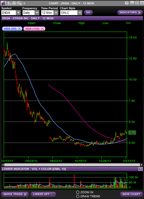 RE: Watchlist - Investor method - goodtyneguy - 2013-03-12 Supermedia SPMD, another low priced stock with plenty of potential. Meru Networks - MERU, here's another low priced stock, one we've discussed before, over at T2W I think. It will need to put in some sideways consolidation first before being able to consider it as a trader play. I've shown a "W" bottom pattern as I have a feint recollection it gets a mention in the book? . RE: Watchlist - Traders method - isatrader - 2013-03-13 Here's the tables of the today's early breakouts and breakdowns in the NYSE and Nasdaq markets to look through for any potential Weinstein picks. NYSE Nasdaq RE: Watchlist - Traders method - isatrader - 2013-03-14 Here's the tables of the today's early breakouts and breakdowns in the NYSE and Nasdaq markets to look through for any potential Weinstein picks. NYSE Nasdaq RE: Watchlist - Traders method - goodtyneguy - 2013-03-14 Supermedia SPMD has just pulled back to the BO level for a trader play but with investor potential. Currently a stop under 3.75 would give it an ATR (200) of around 3, and that's below the 10 wma. I've already posted it in the investor watch list. I've just gone in at 4.51 in my spread betting account. Please note today's PA not shown and the volume came in the day after the "official" BO. Just noticed earnings are out on 21/3/13 hmmmm. Rough Rice and Timber also look interesting. If Routy from over at T2W is still in Ocado he/she will be a happy bunny to day. RE: Watchlist - Traders method - Locked in - 2013-03-14 Zynga (znga) is showing some signs of life with a resent surge in volume (thanks to the legalization of online gambling in the state of NJ). The stock looks to be pulling into stage two with the 30 ma just starting to come into positive territory and relative strength looking good. RE: Watchlist - Traders method - isatrader - 2013-03-14 (2013-03-14, 08:39 PM)goodtyneguy Wrote: If Routy from over at T2W is still in Ocado he/she will be a happy bunny to day. Is funny looking back at my posts. At least I told him the right thing to do with this even though he went off to sharehunter for a trial not long after: Post#889 which was to wait for the consolidation - which began the next day and then to get in on a trader entry on the next breakout with a better risk reward setup, which would have been on the continuation breakout on Mar 12th at 142.60, which would have given a breakout entry risk of 3.69 x ATR(200). RE: Watchlist - Traders method - goodtyneguy - 2013-03-14 (2013-03-14, 10:52 PM)isatrader Wrote:(2013-03-14, 08:39 PM)goodtyneguy Wrote: If Routy from over at T2W is still in Ocado he/she will be a happy bunny to day. Yeah, good advice, the correction has a nice cup shape to it which is always a good sign in my opinion. Whether the deal goes through with Morrisons is another matter. RE: Watchlist - Investor method - isatrader - 2013-03-15 Chesapeake Energy (CHK) has made a Stage 2 breakout this week after completing a one year Stage 1 base. Relative strength is improving and above the zero line, but the main negatives are the poor volume on the breakout (should be double the average at least) and also it has some near term resistance up to around the 25 zone. So a possible investor pick, but with the moving average breadth indicators and the NYSE Bullish Percent at their upper high risk levels above 70%, it's not a good time to be entering investor positions imo. |