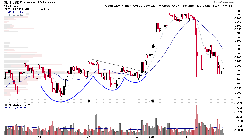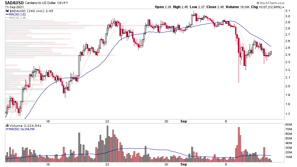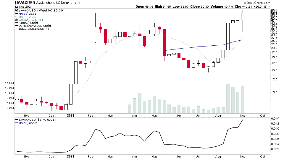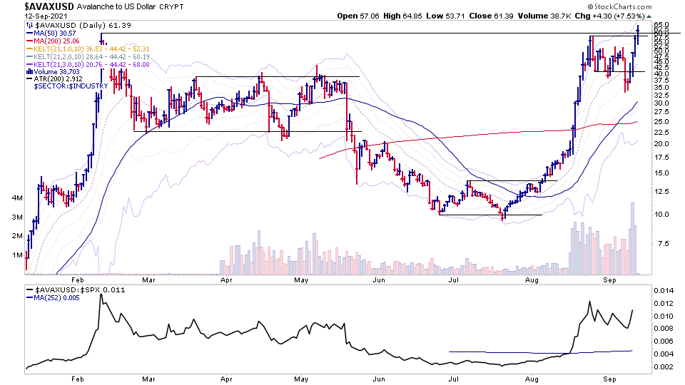 Bitcoin - isatrader - 2021-09-08 Bitcoin holding at the 200 day MA and 50 day MA test so far. But yesterdays price and volume was a definite change of behaviour over the last few months price action. Weekly chart still in Stage 1, so this recent price action likely define the top of the Stage 1 base. RE: Bitcoin - pcabc - 2021-09-08 (2021-09-08, 06:42 PM)isatrader Wrote: Bitcoin holding at the 200 day MA and 50 day MA test so far. But yesterdays price and volume was a definite change of behaviour over the last few months price action. Weekly chart still in Stage 1, so this recent price action likely define the top of the Stage 1 base. It is interesting how closely the close tracks the 200 day SMA and the lower wick the 50 day SMA. Not that those averages cannot be breached, but it is interesting that they were not. RE: Bitcoin - isatrader - 2021-09-08 (2021-09-08, 11:03 PM)pcabc Wrote:(2021-09-08, 06:42 PM)isatrader Wrote: Bitcoin holding at the 200 day MA and 50 day MA test so far. But yesterdays price and volume was a definite change of behaviour over the last few months price action. Weekly chart still in Stage 1, so this recent price action likely define the top of the Stage 1 base. I decided to buy into the weakness today and added this months addition to my crypto pension. Which was roughly a 23% add on buy to $ADA.X Cardano at 2.452 So that takes my average price for Caradano up to 1.569 Crypto majors - isatrader - 2021-09-11 Crypto majors attempting to reverse back up with test like price action. Cardano showing the best RS Percentage of Crypto Currencies above their Moving Averages breadth charts - isatrader - 2021-09-11 Percentage Above their 20 day MA: 28.19% (-55.70%) Percentage Above their 50 day MA: 60.40% (-37.58%) Percentage Above their 150 day MA: 46.98% (-27.52%) Percentage Above their 200 day MA: 43.45% (-29.15%) Average: 44.75% Crypto currencies saw a sharp correction this week with 20%+ drops in a single day in some on Monday. This has taken the Percentage of Crypto Currencies above their Moving Averages breadth charts back down from the upper zone towards the middle and lower zones again with the overall average at 44.75%. So a neutral- field position. $AVAX.X Avalanche - isatrader - 2021-09-12 Looking through some of the crypto alt coins this morning. $AVAX.X Avalanche is of note with the volume surge over the last 4 weeks and potentially sign of strength rally, which has seen it outperform the crypto majors in the near term. Watching for how it develops on any backup. $ALGO.X Algorand - isatrader - 2021-09-12 $ALGO.X Algorand has had its largest ever volume this week as its broken out to new all time highs in Stage 2. It's currently consolidating on diminishing volume above the prior IPO high. Potential for a continuation attempt $ROSE.X Oasis Labs - isatrader - 2021-09-12 $ROSE.X Oasis Labs consolidating above the the IPO-AP high, following a strong volume rally in phase E from the base. Weekly Stage 2 |
