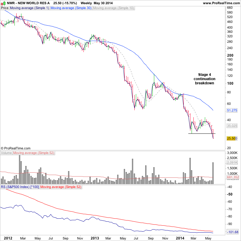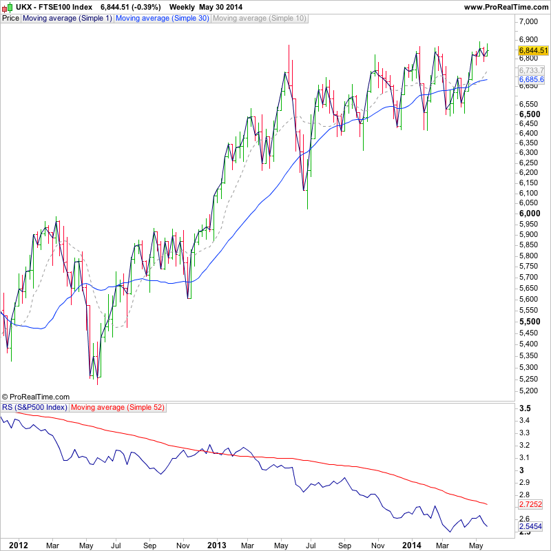RE: UK Stocks - Watchlist and Discussion - isatrader - 2014-06-01 For the UK short watchlist from Friday's scans of the LSE and AIM markets - SPO.L, APF.L, SDR.L, NWR.L, HSP.L, FRES.L RE: UK Stocks - Watchlist and Discussion (Premium) - isatrader - 2014-06-01 Updated breadth stats for the top 300 UK stocks: Price above 50 day MA: 170 (56.67%) Price above 150 day MA: 160 (53.33%) Price above 200 day MA: 170 (56.67%) So not much movement on the medium and long term MAs since I last looked a few weeks back, but a bigger improvement on the short term which has got back above the 50% level. But all still in the mid range of the scale after being much higher earlier in the year and hence still Stage 3 territory imo on the breadth. RE: UK Stocks - Watchlist and Discussion (Premium) - pcabc - 2014-06-01 (2014-06-01, 09:04 PM)isatrader Wrote: Updated breadth stats for the top 300 UK stocks: Are we on the cusp of a continuation versus start of a bear? I really am wondering what is going on. I note that a 50/50 world/uk fund that I have part of a pension in has just made a new high. RE: UK Stocks - Watchlist and Discussion (Premium) - isatrader - 2014-06-01 (2014-06-01, 09:19 PM)pcabc Wrote: Are we on the cusp of a continuation versus start of a bear? I really am wondering what is going on. I note that a 50/50 world/uk fund that I have part of a pension in has just made a new high. Stage 4 doesn't necessarily mean that there will be a bear market as during major bull markets the Stage 4 breakdowns tend to be short, sharp, flushes which die out very quickly as bargain hunters come in. But you never know whether a breakdown into Stage 4 is just a correction or the start of a bear market and hence when it does happen Weinstein's method recommends being predominately in cash or short the market. Currently, the UK market is in varying phases of Stage 3, as can be seen from the FTSE100, FTSE 250 and AIM All Share Indexes below: As with the US, the UK market is seeing a rotation to the larger cap value stocks at the moment, with small and micro cap stocks getting hit hard as you'll have seen from the large number of Stage 3 and 4 stocks appearing in the daily watchlists. But the quality of any new breakouts has continued to be quite poor, and so that makes me cautious still on whether the breakouts in the larger caps is to be trusted or whether it's just the last part of this phase of the bull run that began in 2011, as the large cap defensive stocks are always the last to breakdown I believe. So I'm continuing to sit on sidelines, as I have since late March, as the quality and quantity of Stage 4A breakdowns continues to outnumber the quality and quantity of Stage 2A breakouts by a long way. Although last week was the first week in a while, that the Stage 2 breakouts and continuations where showing better quality imo. So a short term improvement, which can be seen in the bounces in the small and micro cap charts above. RE: UK Stocks - Watchlist and Discussion (Premium) - isatrader - 2014-06-02 For the UK long watchlist today - MGNS.L, BGBL.L, DIG.L RE: UK Stocks - Watchlist and Discussion (Premium) - pcabc - 2014-06-02 Thank you for your insight. (2014-06-01, 09:50 PM)isatrader Wrote:Thing with that is that you don't know which of the two it is until it has happened, so I see caution being sensible.(2014-06-01, 09:19 PM)pcabc Wrote: Are we on the cusp of a continuation versus start of a bear? I really am wondering what is going on. I note that a 50/50 world/uk fund that I have part of a pension in has just made a new high. Quote:Currently, the UK market is in varying phases of Stage 3, as can be seen from the FTSE100, FTSE 250 and AIM All Share Indexes below: It would be interesting to see a FTSE All Share or FTSE350 Advance Decline chart. I've notice the difference between the FTSE 100 and FTSE 250 charts but did not think about it too much in terms of advance decline. I suppose as the large caps have higher market capitalization then you'd think that there was still money going into the market overall. Looking at an FTSE All Share chart the most recent high is lower than the previous one, but the last low was higher than the previous low. Given it is market cap weighted then it does appear that the wider market is dropping despite the FTSE 100. Quote:So I'm continuing to sit on sidelines, as I have since late March, as the quality and quantity of Stage 4A breakdowns continues to outnumber the quality and quantity of Stage 2A breakouts by a long way. Although last week was the first week in a while, that the Stage 2 breakouts and continuations where showing better quality imo. So a short term improvement, which can be seen in the bounces in the small and micro cap charts above. I seem to be much less conservative than you and others here. This is somewhat revealing as I thought I was conservative by nature. Though I have sold quite a lot of things over the last couple of months I still have a number of stocks and funds that are still in stage 2, though nothing is stellar. Portfolio seems to fluctuate about an average that is still creeping higher - though the rate seems quite slow. Though I'm leaving a significant proportion of cash I've also diversified some into bond funds and also into a European property fund, as both are in strong uptrends. In addition UK (at least) REIT's seem to be breaking out and property over the long term has lowish correlation with stocks. All fund are zero load so I won't flush away any modest gains with fees. Time will tell how good an idea this is, as the lesson learn with some of my more recent equity fund trades was not to buy too late into a stage 2, so I hope I am not repeating my error, rather fine tuning my method. RE: UK Stocks - Watchlist and Discussion (Premium) - isatrader - 2014-06-03 (2014-06-02, 08:01 PM)pcabc Wrote: It would be interesting to see a FTSE All Share or FTSE350 Advance Decline chart. I've notice the difference between the FTSE 100 and FTSE 250 c