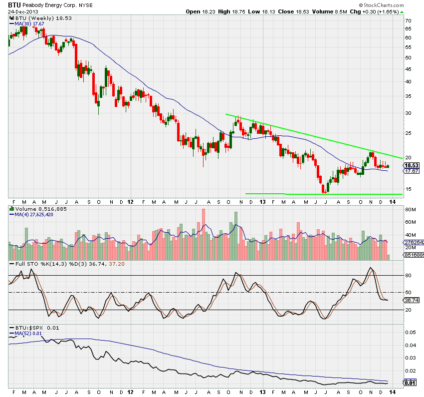 RE: Watchlist - Investor method - theory6453 - 2013-12-26 Merry Christmas, All, as it is still Xmas here in the States for another couple hours. I hope everyone had a good holiday or enjoyed some Chinese food or had fun with whatever they do when the markets are closed on Dec. 25. ![]() Here are a couple of investors setups I have been watching recently... The first two are Stage 1 setups for the watchlist. Both are energy plays which is supposed to be a top performing sector for 2014: BTU and WTL. BTU was at $70 two years ago and is now trading around $18. I would like to see the 30 wma start turning up and a move into the $20 range with good volume as a potential Stage 2A move. Similar with WLT… trading at $130 two years ago and is down 90% to trade currently at $15. Looks like it may finally have found a bottom in the $10 range. Again, 30 wma turning upwards with good volume and move into the $20 range would be good signal for a move into Stage 2A. The last setup is MY which has been highlighted previously as a Stage 2A in the Solar sub-group which has performed quite well recently. I was recently in MY back in October and I think it is almost done with its current pullback and is ready to make another large move. It’s currently @ $2.04 and I believe it’s about oversold. There could be some more slight downward movement to the $1.80 - $1.90 range but I think there is a nice trendline that is providing support. The previous Stage 1 resistance line now also appears to be providing a nice little support wedge. If I can get the right price in the next couple days or early next week, I will likely make an entry with a stop around 3 times the 200 day ATR, which would be in the $1.50 - $1.60 range. Cheers. ![]() (Apologies if these have already been highlighted recently and I missed it) RE: Watchlist - Investor method - theory6453 - 2013-12-26 (2013-12-26, 01:10 AM)isatrader Wrote: DRYS made a Stage 2 continuation breakout from a two and half year head and shoulders base, which could be a longer term monthly Stage 2A breakout if it holds to the end of the month. Swing target from the long term base is 6.22 Great post and great chart. I bought this off the open today based on this chart and continuation move and it was up over 12% today. Love it. Thanks Isa! Keep up the good work!