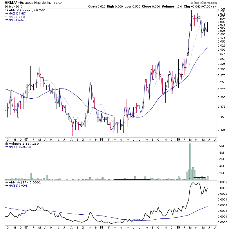 RE: Stage Analysis Beginners Questions-exe.to - briansmith456 - 2019-05-27 (2019-05-27, 08:08 PM)isatrader Wrote: I like to use the ATR with a 52 week setting. So change the Parameters setting to 52 if you'd like to use that, but any amount is acceptable really as it depends on your trading timescale as to what you should use. So 52 weeks is just my preferred setting for investor positions, as it's the average weekly price range of the stock from the last year. Much appreciated your explanation of how to use ATR. RE: Stage Analysis Beginners Questions-ABM.V - briansmith456 - 2019-05-29 Hi, Can you please comment on ABM.V (attached). It has based for a couple of years and finally broken out recently on huge volume. The proper buy point was around 32 cents on the breakout I believe but I am wondering if it is in buy territory right now or maybe best to wait and hope it gets closer to the 30 ema (it is about 20% above the 30 ema currently). I have added the monthly chart as I see the cloud is huge and the price has just penetrated it so wondering if you also look at the monthly chart in terms of the cloud at least as based on this chart alone it looks like maybe this stock is not a buy given the huge cloud on the monthly so perhaps the easy money was already made. Thanks for your thoughts. Brian RE: Stage Analysis Beginners Questions-ABM.V - isatrader - 2019-05-29 (2019-05-29, 11:17 AM)briansmith456 Wrote: Hi, Hi Brian, With regards to the monthly, I don't tend to look at the monthly cloud as much in a recovery stock, as it's guaranteed to be under it, and if it had a large Stage 4 to be a very big cloud. So I don't have it on the monthly chart. On the weekly, the breakout in February was very strong and rising outsized volume for three weeks before starting to consolidate. The consolidation has formed a flag pattern and is trading below the declining 10 week MA currently, but remains above a strongly rising 30 week sma. The volume on the consolidation / pullback period has been less than the advance, and the relative performance versus the S&P 500 remains strong above a rising zero line. I don't have the sector charts for it as it's a Canadian small cap, in the Materials / Other Mines sector. But the basic materials industry sector has been one of the weakest during the recovery since Christmas in the US at least. The other negative I can see is the thinness of the stock, as if you look at the intraday charts, it appears to be very thinly traded at times, which tends to mean higher spreads. In terms of trading it, the 52 week ATR is 0.061 currently, and the most recent swing low under the 50 day MA is 0.52. So the trader stop loss position would be around 0.499 imo, and so with my maximum 2x the 52 week ATR risk tolerance, currently the highest entry point would be 0.621, which is just around where the recent downtrend line meets. So wouldn't meet my risk requirements personally. But is an interesting looking chart. RE: Stage Analysis Beginners Questions-ABM.V - briansmith456 - 2019-05-30 (2019-05-29, 11:09 PM)isatrader Wrote: Hi Brian, Thanks, I very much appreciate your analysis. All your comments are very informative and I am learning a lot. Brian RE: Stage Analysis Beginners Questions - moneymaker - 2019-06-04 Hi everyone, I'm reading Stan's book and I'm wondering how does everyone look at the performance of the different sectors? Do you choose an ETF for each sector and you monitor that particular ETF? If so, I'd appreciate if someone shared their ETFs. Thanks in advance. RE: Stage Analysis Beginners Questions - pcabc - 2019-06-04 (2019-06-04, 08:39 PM)moneymaker Wrote: Hi everyone, For the US sector SPDR ETFs are quite handy for this. I use the relative strength of the ETFs against each other to take a view on the strongest sector.  Depending on where you are getting your data there may be other options. For the UK there are sector indicies, NMXnnnn, which I find less useful, partly as the UK has not been doing so well and partly the sectors are numerous with fewer consituents. RE: Stage Analysis Beginners Questions - moneymaker - 2019-06-08 Hi everyone, I'm using tradingview.com for my charts and I've noticed something odd with the moving averages. When I change the viewing range, it seems like the moving average changes but it shouldn't. For example, look at these images: In the second image (6 months range), the MA(150) closely follows the SP between February and May. When I change the viewing range to 1 year, the moving average changes and doesn't follow the same distribution anymore. All I did between the second and first image was switch the viewing range from 6 months to 1 year. This is odd, right? RE: Stage Analysis Beginners Questions - briansmith456 - 2019-06-08 Hi, I was hoping you could comment on gold miner GCM.TO (chart attached). The 30 ema and 30 ma are both rising and the 10 ma is flat. Volume on the breakout has been above average. Price is extended from 30 ema so I was wondering whether perhaps it could still be considered a proper entry long if it comes back to test the trendline around $3.65 (this would allow the 30 ema to catch up some). Thanks for your thoughts. Brian |